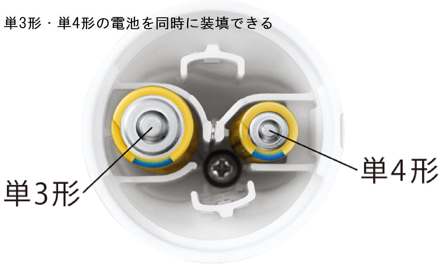 最長で約10時間30分連続使用可能(※乾電池エボルタを単3形と単4形の両サイズ使用時の合計時間。連続使用時は、各サイズのスイッチの切り替え作業が必要です。)
