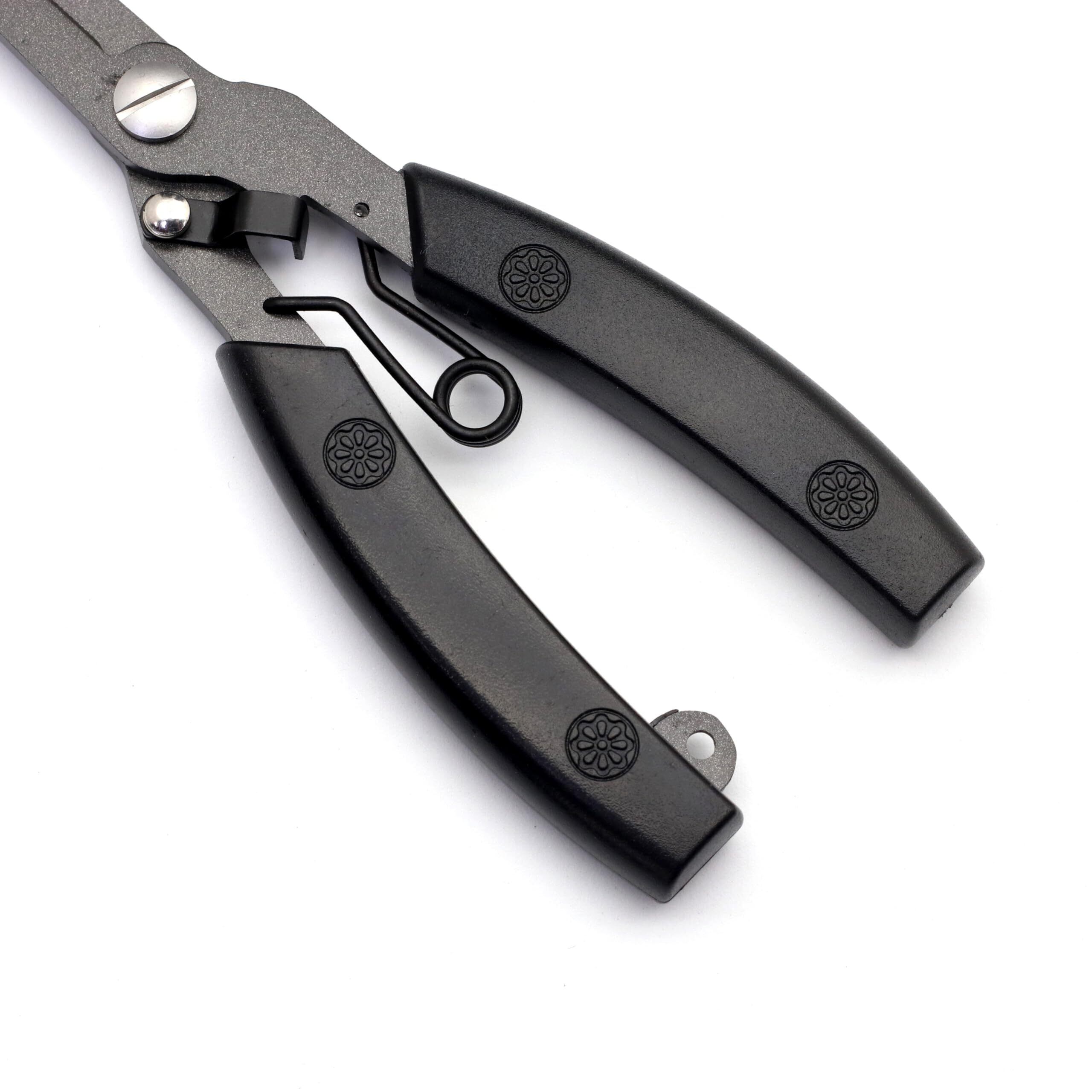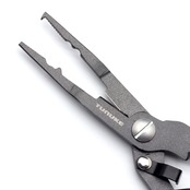 スプリットリングオープナー(#3-#6スプリットリング推奨)、ギザ刃ラインカッター(ナイロン・フロロ・PE対応)、片手で開閉可能なロック部、スリーブカシメ、エンドロープ・ランヤード取付穴