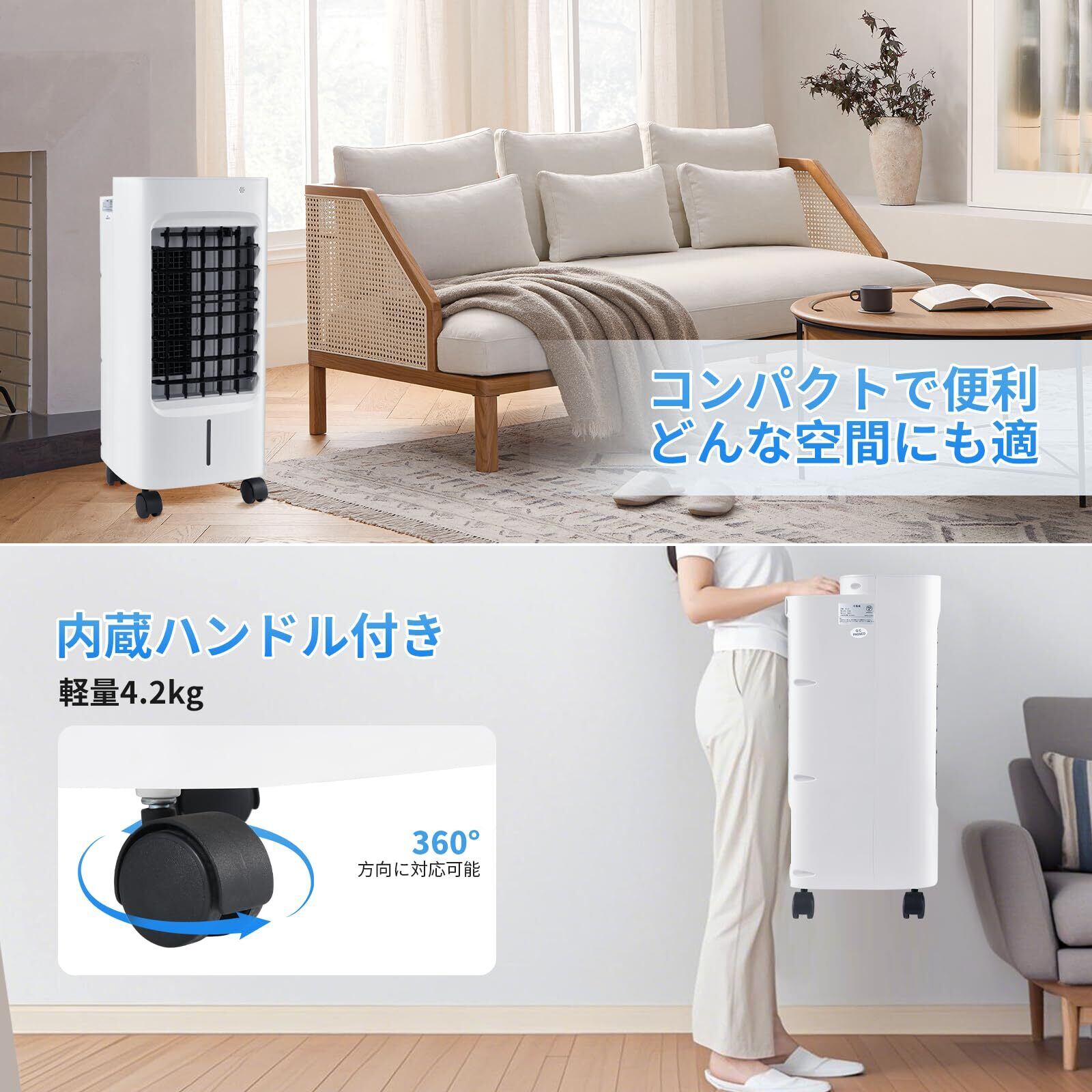 【製品仕様と安心設計】家用型冷風機 本体サイズ:263×271×582mm/梱包サイズ:305×315×610mm 重量:約4.2kg(梱包時:5.4kg)/電源コード長さ:1.8m 電源:100V 50/60Hz/消費電力65W(超節電タイプ) 静音設計:約40〜50dB/水タンク容量:4L(引き出し式) 風量モード:強・中・弱・自然風・睡眠の5モード切替 タイマー機能:最大12時間設定可能/1年間メーカー保証付き PSE認証取得済み・日本語取扱説明書付き