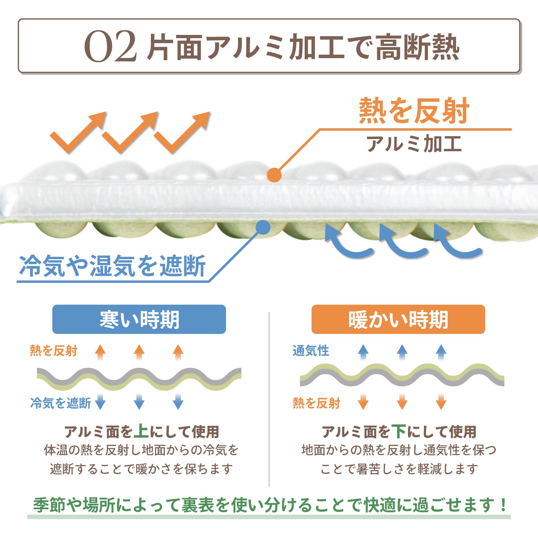 マットの片面にアルミ加工を施しているので、地面からの冷気を遮断したい時はアルミ面が体からの体温を反射させる事で熱を閉じ込め暖かさを保ちます。アルミ面を下側に向けて使用すれば、地面からの熱をアルミ面が遮断します。