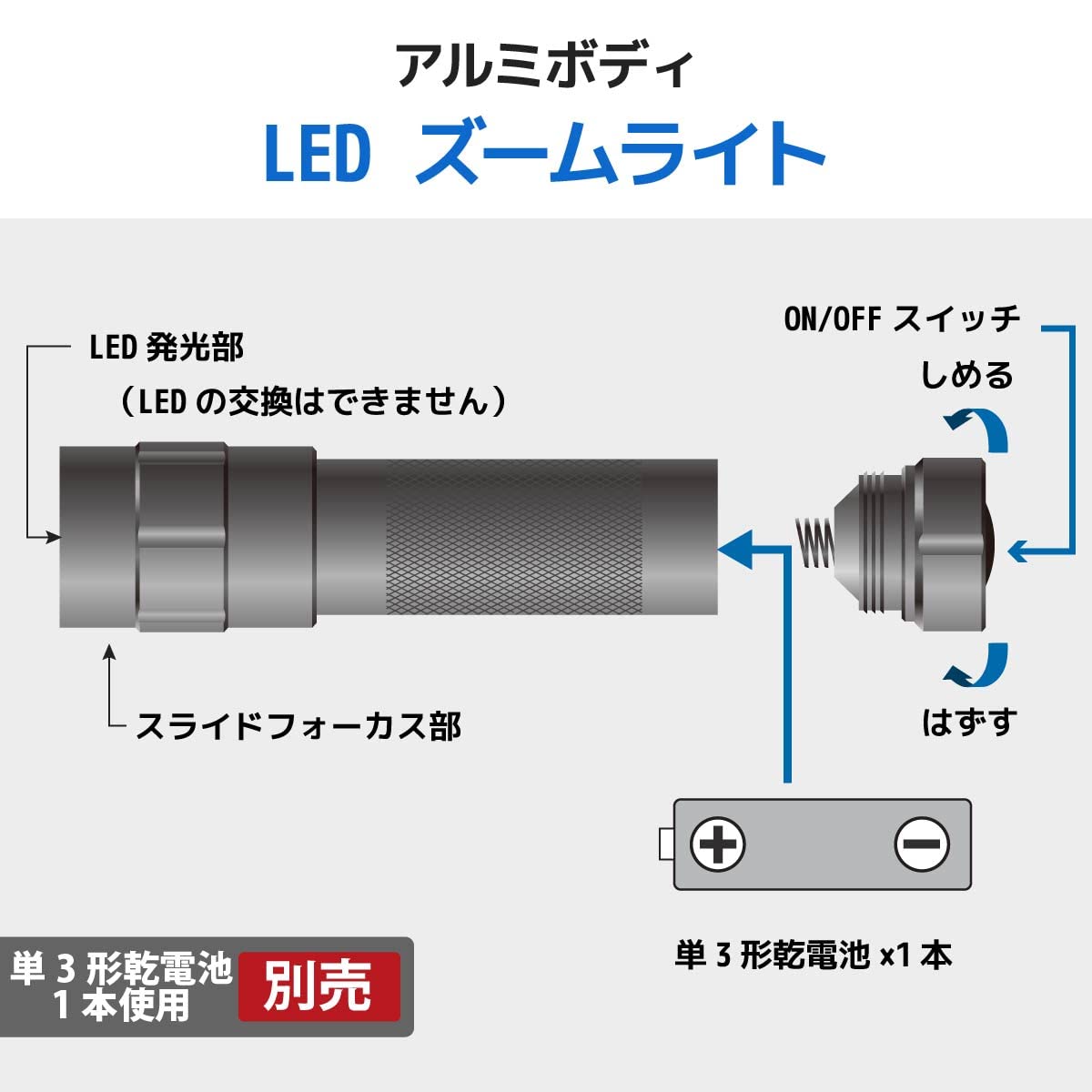 【 仕 様 】 ◆電源:単3形乾電池1本(別売) ◆光源:白色系LED1個(LED交換不可) ◆最大消費電流:約150mA ◆連続使用時間:※未使用・新品のアルカリ乾電池使用時 明るさ10%まで約16時間、明るさ5 lmまで約17.5時間 ◆光束:約60 lm(ルーメン) ◆照射距離:約39m