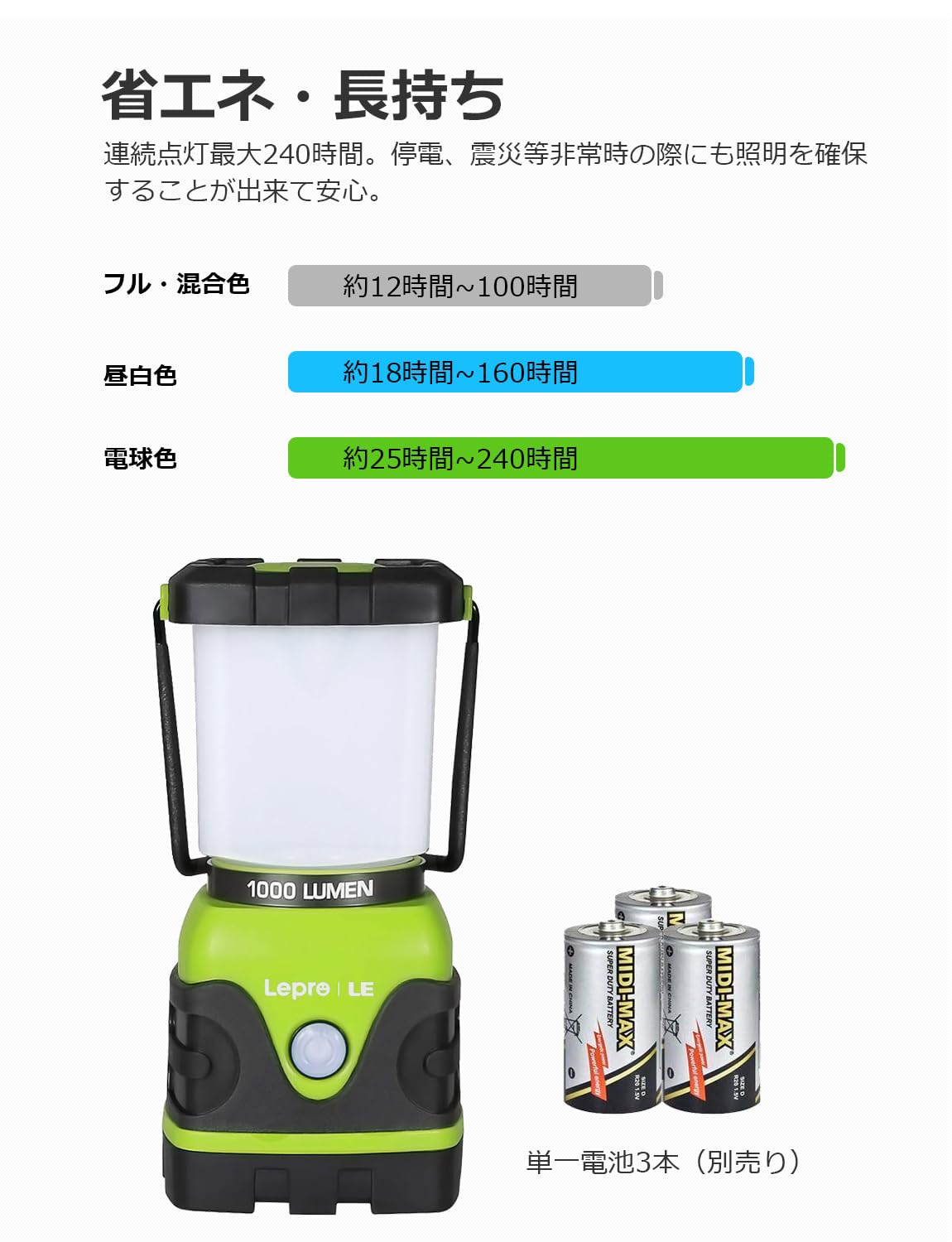 【超高輝度ledランタン】高輝度ledチップを採用し、明るさは最大1000ルーメンに達し、ビーム角も360°広く、前方や周りを明るく照らしてくれます。停電時に部屋全体を明るく照らし、キャンプの時にもメインランタンとして使えます。最大240時間(明るさ、乾電池次第)連続点灯できるため、停電、 震災等非常時の際にも心置きなくご利用頂けます。