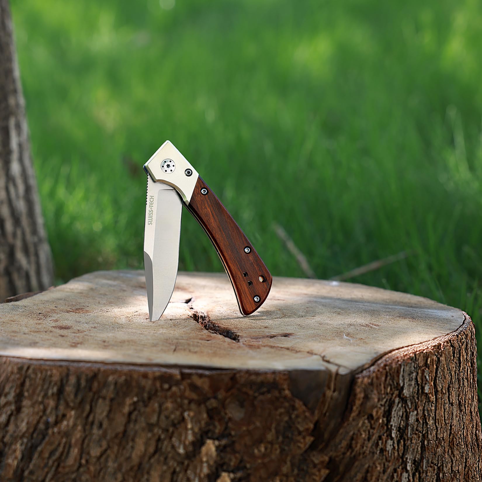 SWISS+TECH フォールディングナイフ アウトドアナイフ 折りたたみ式 D2鋼 ブレード 木製ハンドル 釣り キャンプ コレクション プレゼント 鑑賞用 滑り止め