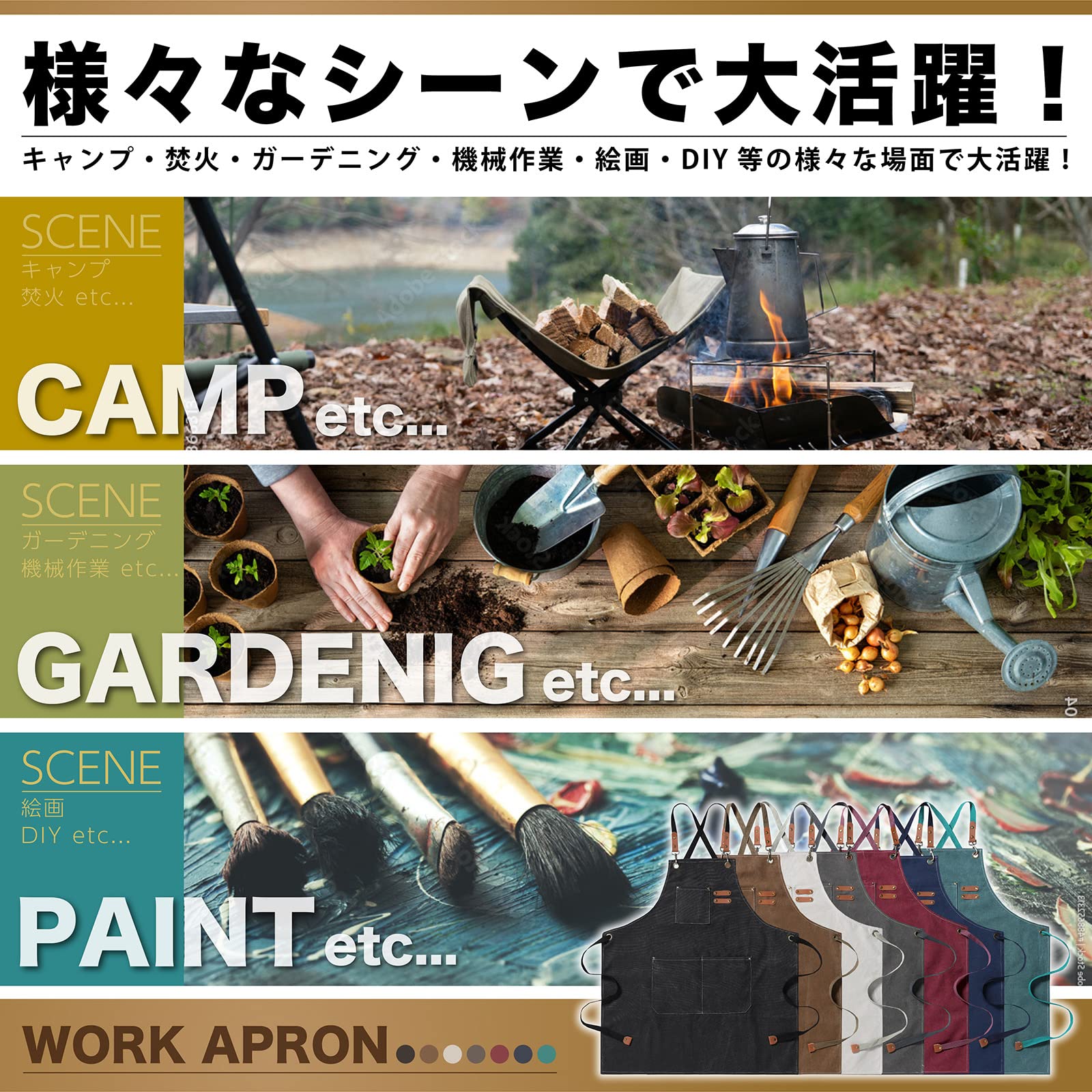 無地でスタイリッシュなデザインかつ高い耐久性にこだわったため、キャンプ・焚火・ガーデニング・機械作業・絵画・DIY・車やバイク整備・美容室などあらゆるシーンで使用可能なエプロンに仕上がりました。