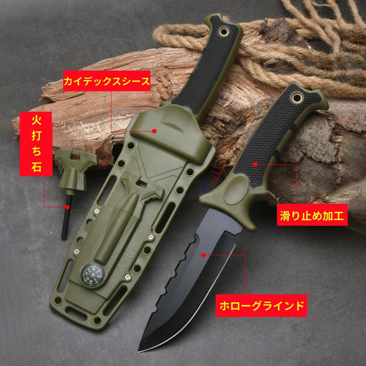 【特徴】登山、キャンプ、釣りなどで活躍するアウトドアナイフ。シースナイフ以外に、火打ち石棒がカイデックスシースとセットになっており、アウトドアの際などの緊急時に便利なアイテムです。※コンパスは飾り用です。