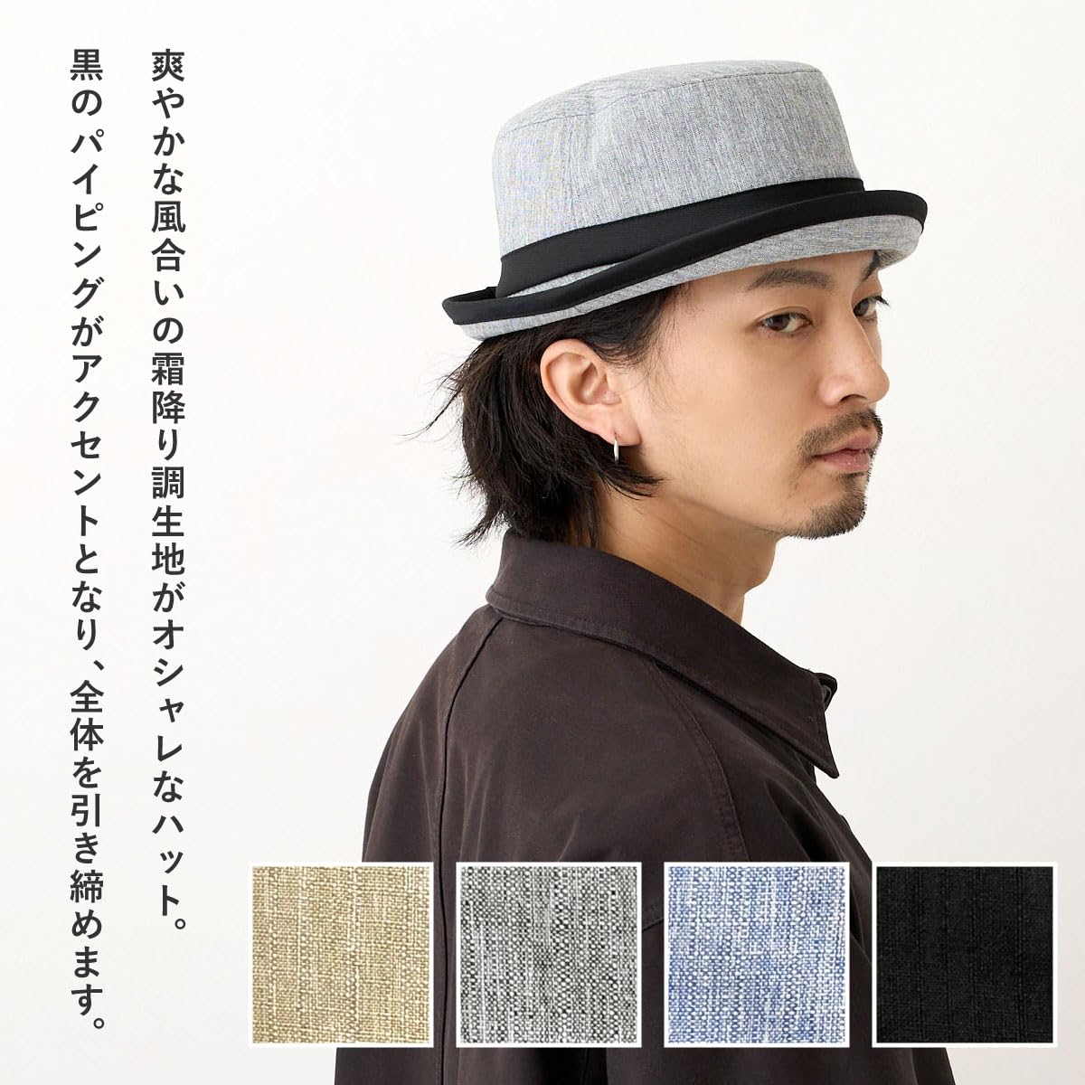 爽やかな風合いの霜降り調生地に黒のパイピングがオシャレなポークパイハット 中折れハットほどカッチリしすぎない「ラフ」な被り心地でも「きちんと感」を演出できるから、大人のカジュアルコーデにぴったりのアイテムです。