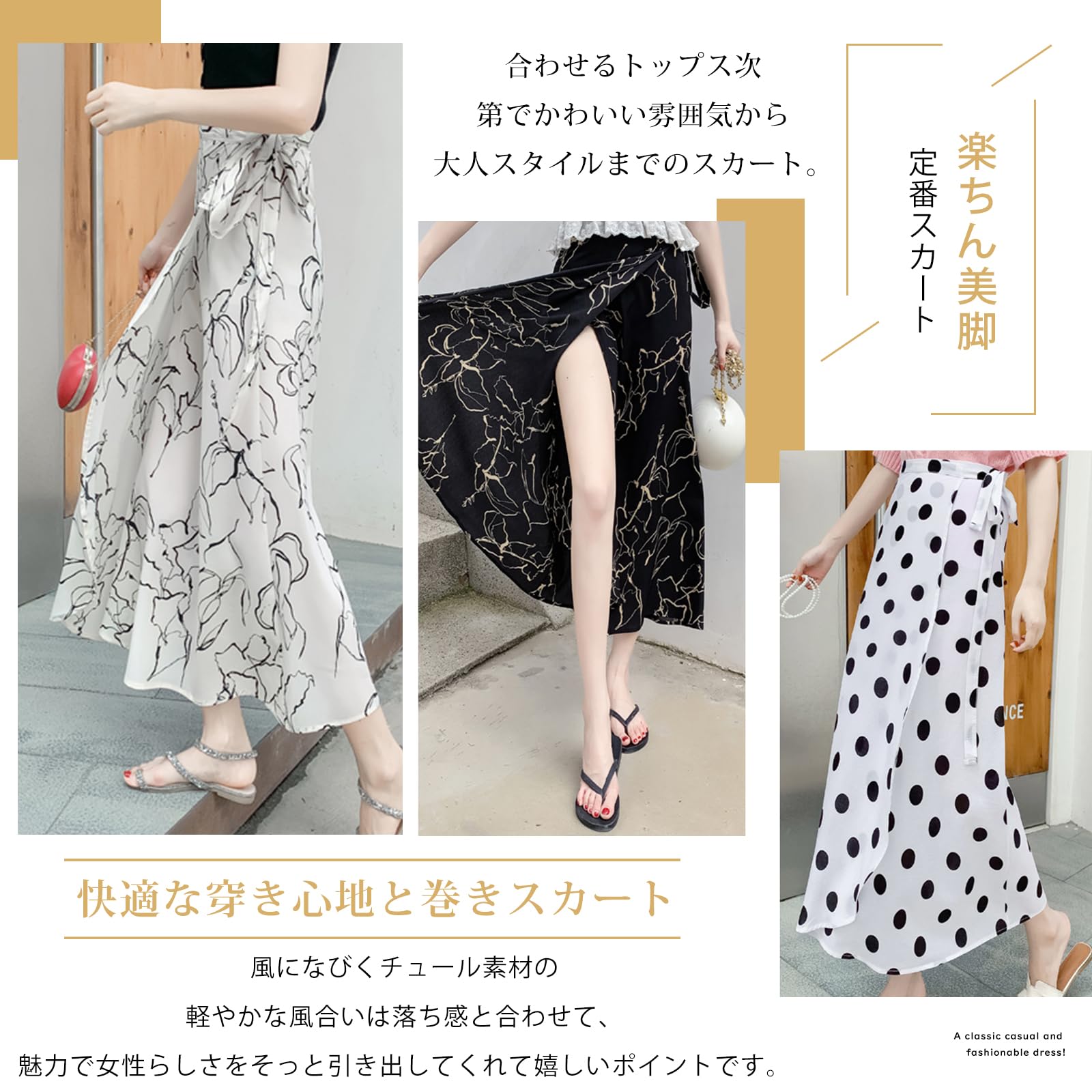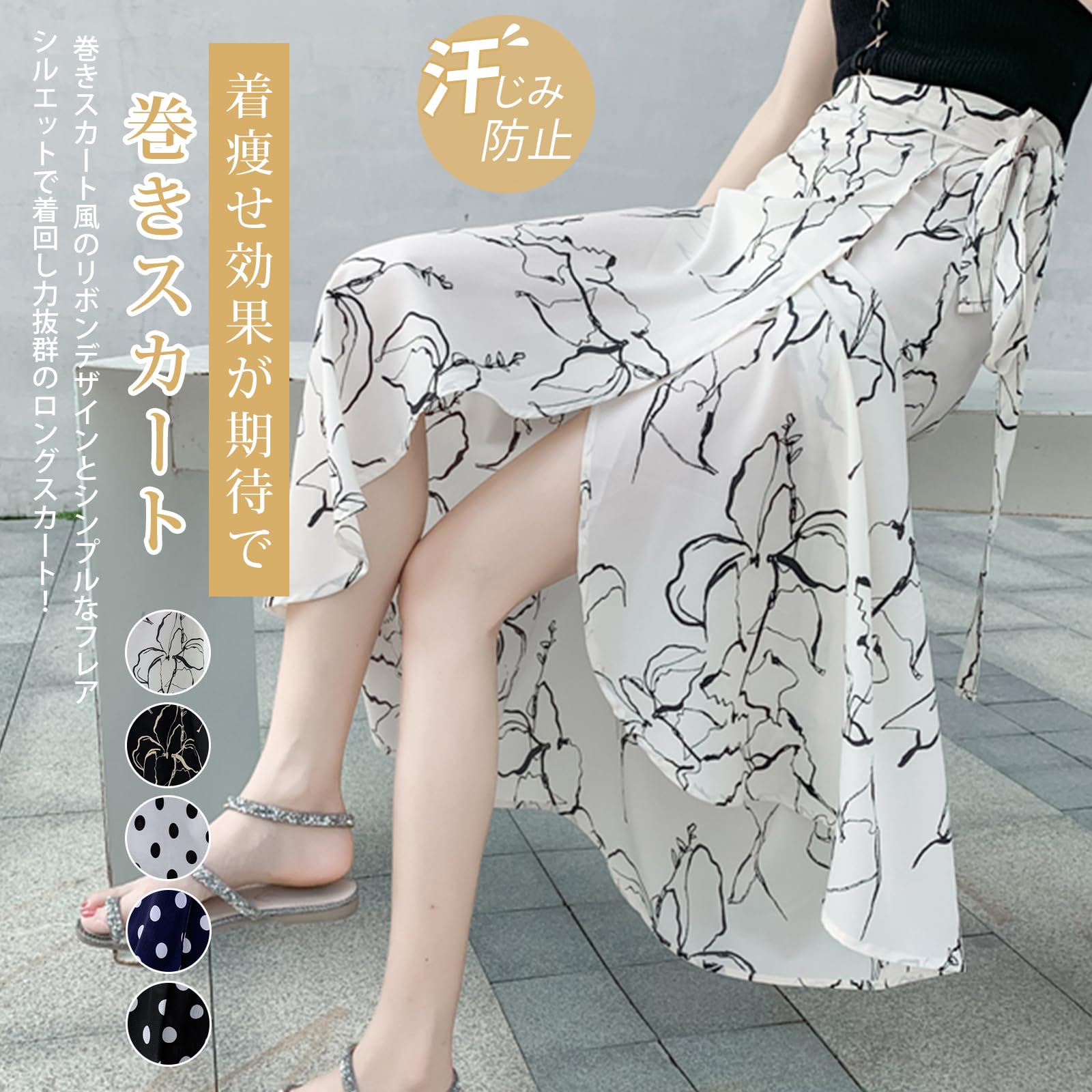 [Leadamon-oee] スカート レディース ロング ドット柄 花柄 巻きスカート リボン ハイウエスト Aライン 体型カバー 大きいサイズ 薄手 おしゃれ 着痩せ 普段着 春 夏