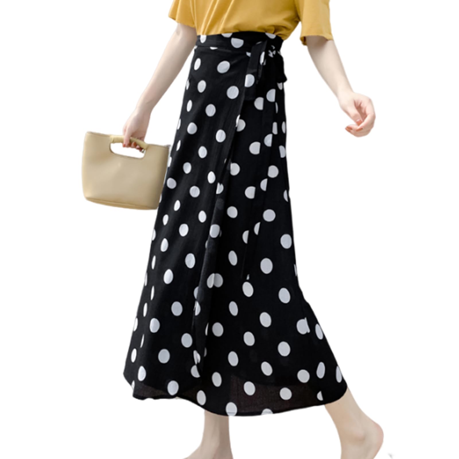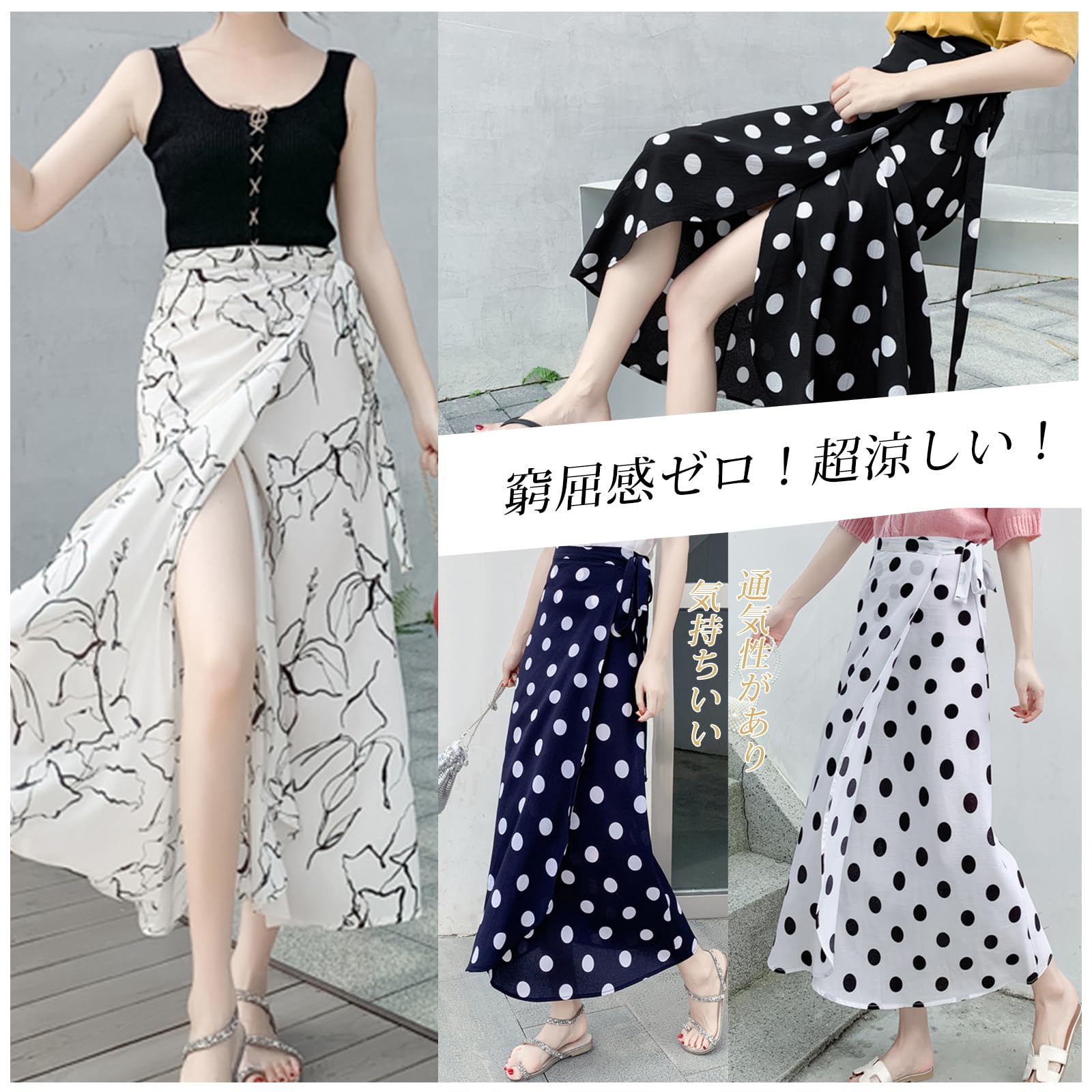 【在庫セール】[Leadamon-oee] スカート レディース ロング ドット柄 花柄 巻きスカート リボン ハイウエスト Aライン 体型カバー 大きいサイズ 薄手 おしゃれ 着痩せ 普段着 春 夏 | asaRulu0511