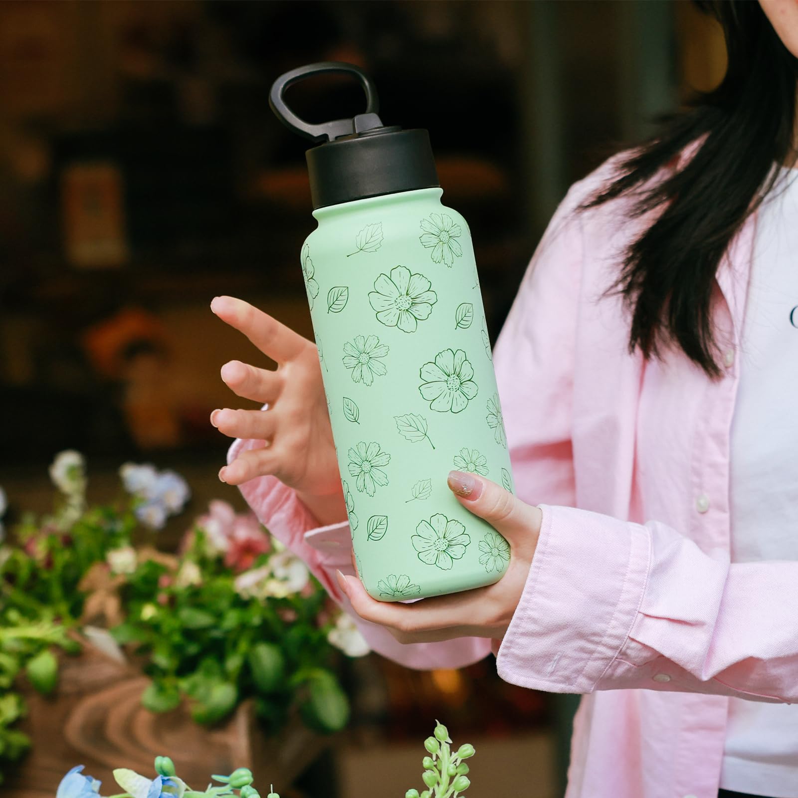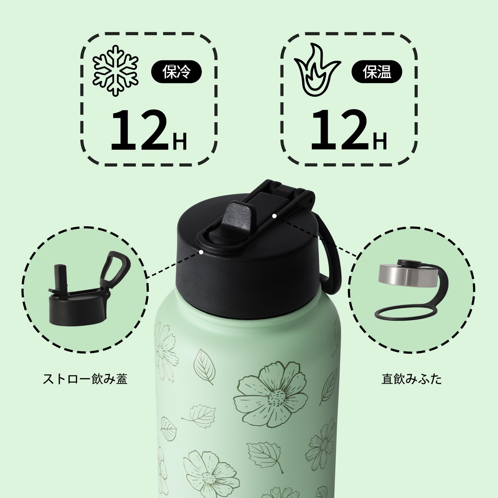 BOTTLE BOTTLE 水筒 1000ml ステンレス ウォーターボトル 女の子 直飲み ストロー付き 二重構造 保温保冷 真空断熱 持ち運び アウトドア グリーンフラワー