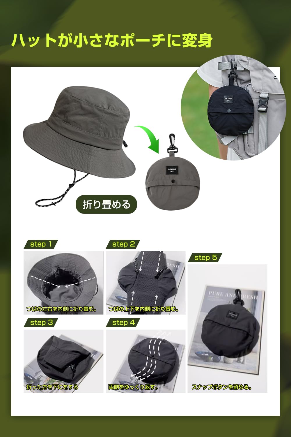 [Petasonien] サファリハット メンズ【折りたたみ 収納一体・UVカット・撥水加工】 コンパクト 帽子 紫外線対策 日焼け 防水 通気速乾 つば広 日除け 軽量 小顔 バケットハット サイズ調整ひも 釣り アウトドア