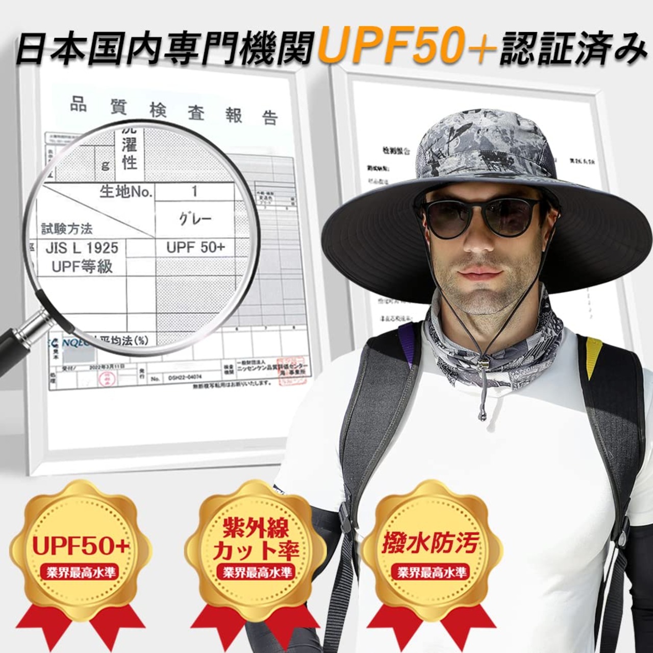 【日本専門機関認証済みUPF50+】日本検査機関のUV遮蔽率測定試験で証明済み。安心の物理カットUPF50+(衣類の紫外線防御指数UPF値の中で最高値)。ハットは12cmもある幅広いツバは紫外線遮蔽率99%以上で、360度で紫外線やその他の有害な光線を効果的に防ぎ、目や髪の毛、お肌を守ります。さらりとした快適な被り心地で、一年中も使用できます。