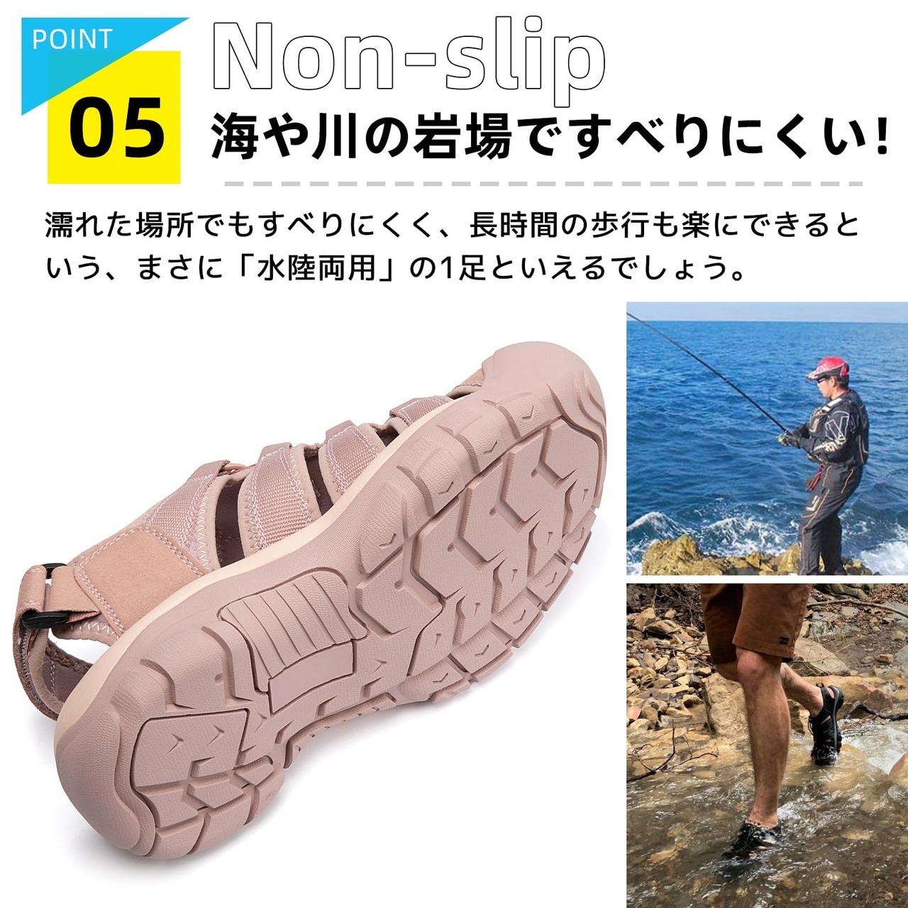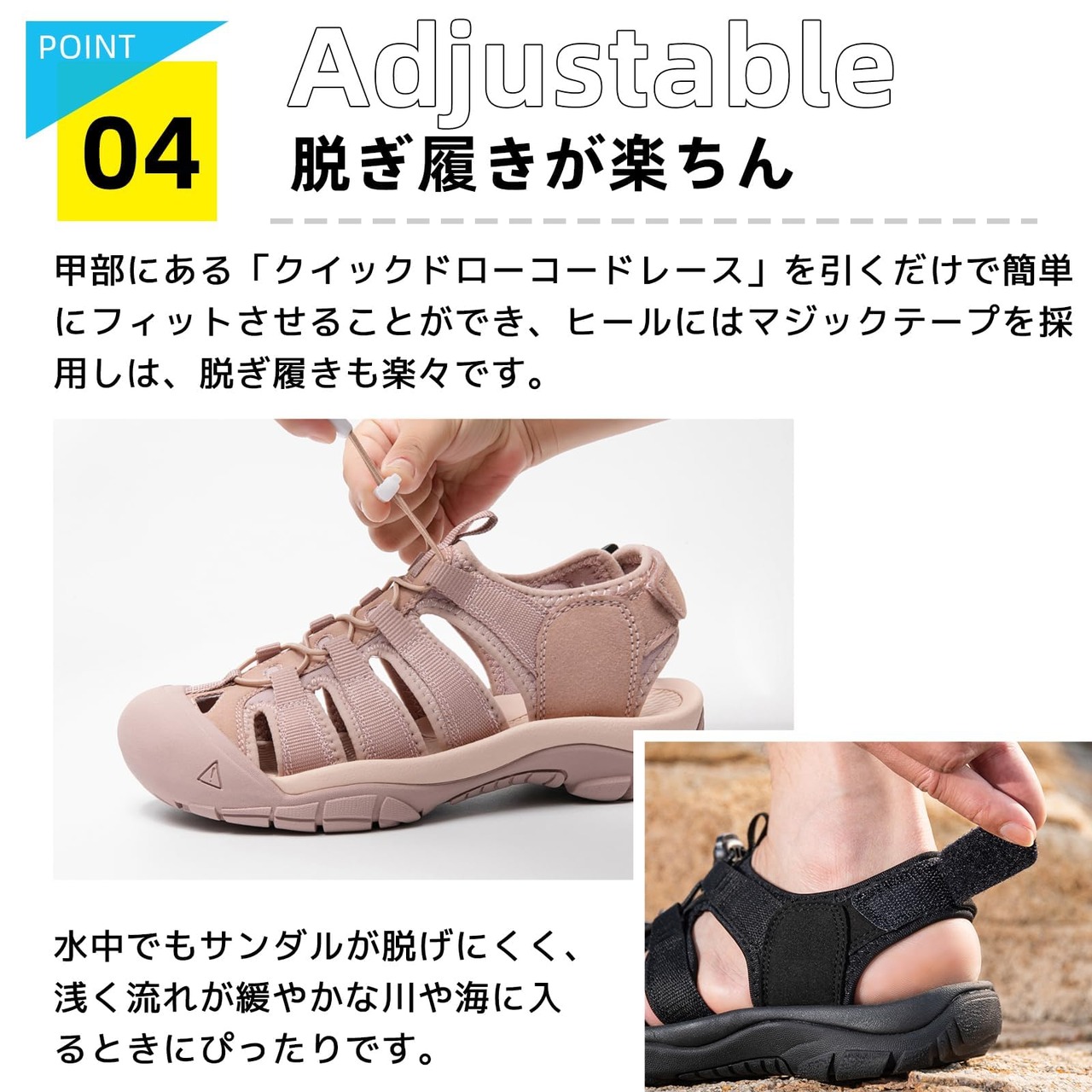 デザイン性・機能性と文句なしのスポーツサンダルです。アウトドア雰囲気の強いルックスが特徴で、カジュアルな着こなしほど良く合います。●つま先部分がカバーされているので、砂利道や砂浜でも安心してお履きいただけます。●靴底には大きめの凹凸が施されているので、滑りにくく快適歩行を実現します。●動いても動いても快適な速乾性ライニング。軽量でコンパクトな為、トラベル用のセカンドシューズにも最適。ウォーターサンダルでありながら、ハイキングシューズでもある。どんなアドベンチャーにもこの一足。ビーチ、海原、キャンプ、釣り、登山、湖、川、全てに最適。・父の日ギフトとしてもおすすめ。