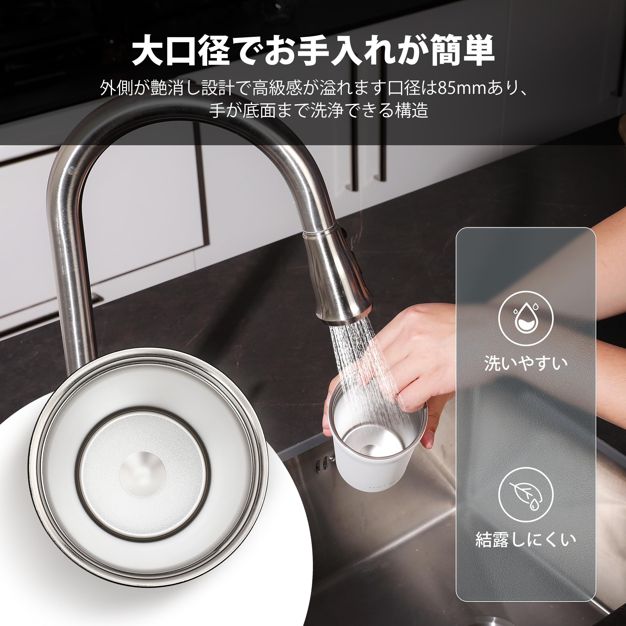 【保冷保温効果が長持ち】外からの熱を遮断する真空断熱構造ですので、温かい飲み物の温度をキープすることができます。真空構造で結露も出ず、冷たい飲み物をより長くお楽しみいただけます。(こっちの保冷保温時間の測定環境は23±2°Cです。環境温度と液体熱度によって保冷保温時間が変化することがあります。夏の高温や冬の低温は保冷保温時間に大きく影響します)