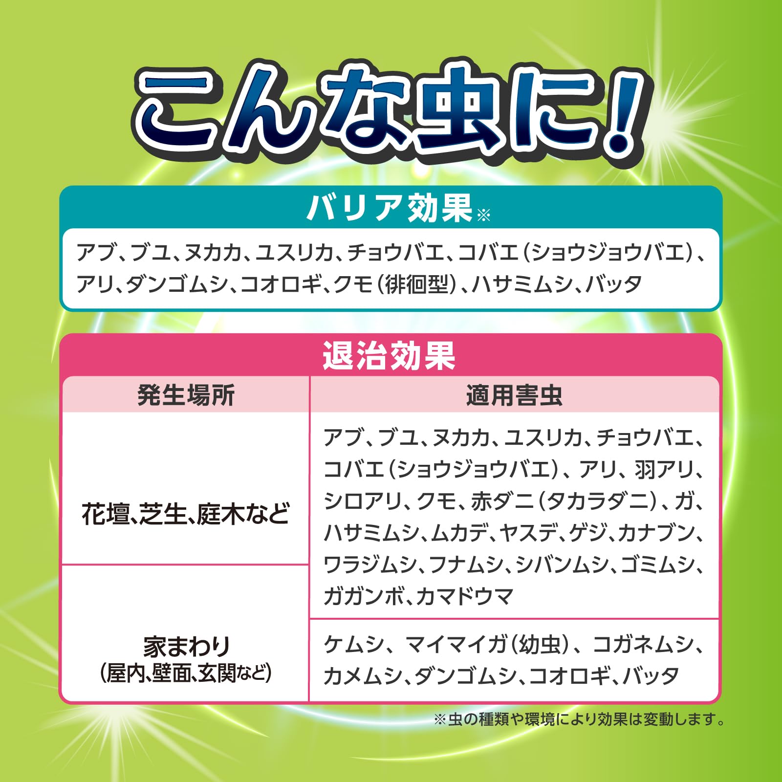 ●地面にスプレーして飛ぶ虫・歩く虫をよせつけない ●バリア効果は約4時間 ●イヤな虫をバリア 地面にスプレーして飛ぶ虫・歩く虫をよせつけない!バリア効果は約4時間【使用量の目安:1㎡に5プッシュ】 ●イヤな虫を退治 イヤな虫に直接スプレーしてすばやく退治! ●安心の水溶タイプ 植物にやさしく、火を扱う場所でも使いやすい