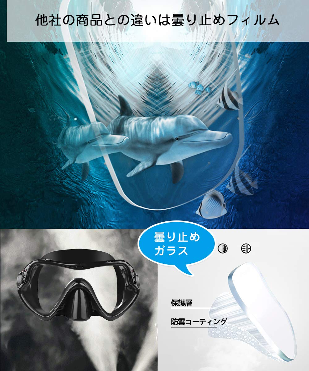 【本格的防曇】:ゴーグルには新しい防曇技術処理が施されてありますのでクリアな視界を最大に保ってくれます。強化ガラスを採用しているゴーグルは耐衝撃性に強く、シュノーケリング楽しむことが出来ます。水中での魚の動きや海底の様子などもハッキリと捉えることが出来ます。また抗UV効果と耐衝撃性と耐久性にも優れています。