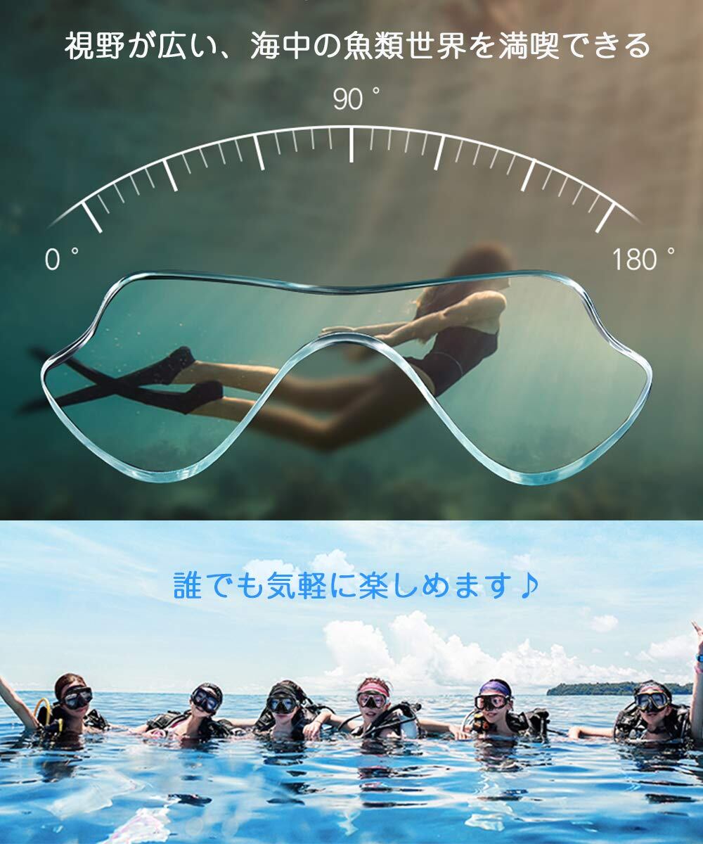 【視野広いシュノーケルセット】:視野が広い、海中の魚類世界を満喫できます。ご使用する時に、スノーケルをマスクのベルトにクリップして固定することができます。肺活量の少ない女性や子供には特に便利です。男性も女性も子供もご使用いただけるサイズ。沖縄、伊豆、福井など日本には綺麗な海がたくさんあります。「今年、初めてチャレンジする!」という人も、「前回は上手くいかなかった…」という人にオススメです。※シュノーケル&マスクを事前に購入する人は、自宅のお風呂で試してみてください。水が口に入らないようするのも練習ポイントです。
