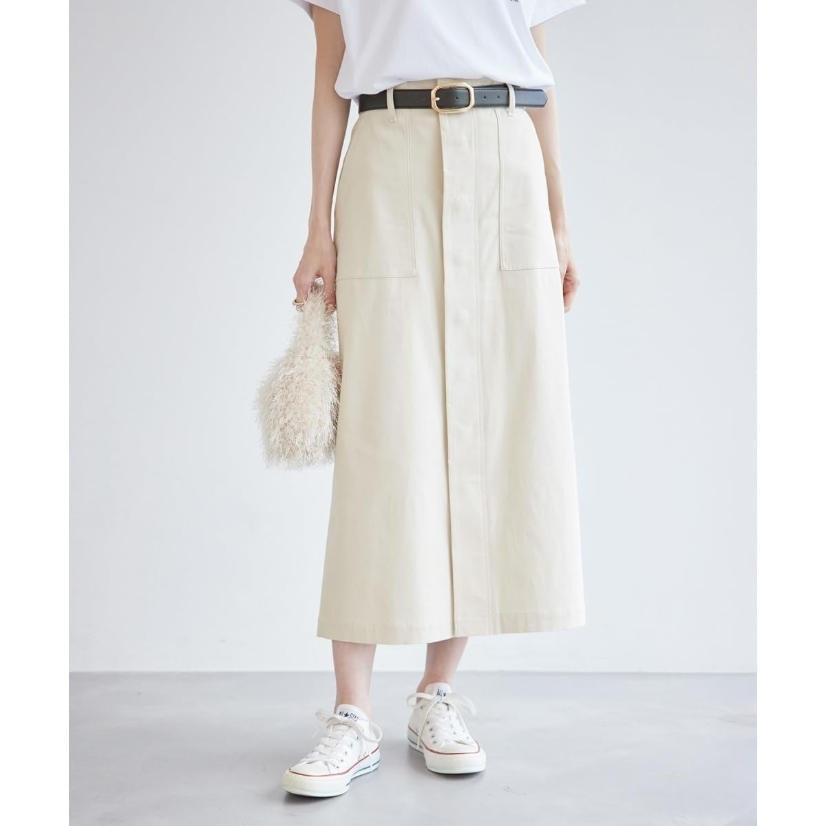 デザイン・シルエット : カジュアルなベイカーパンツをモチーフにしたロングタイトスカート。フロントの大きなパッチポケットや、バックのフラップポケットがアクセントのミリタリーボトム。