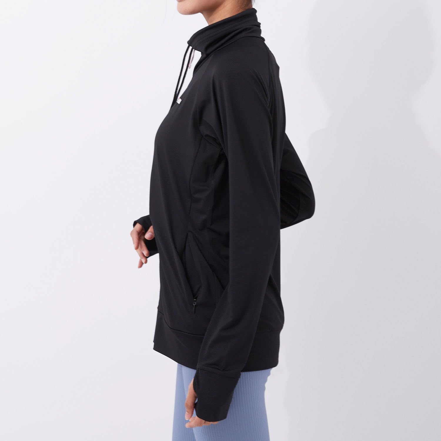 絞りのついたスタンドハイネックで首の日焼けも防ぎます。