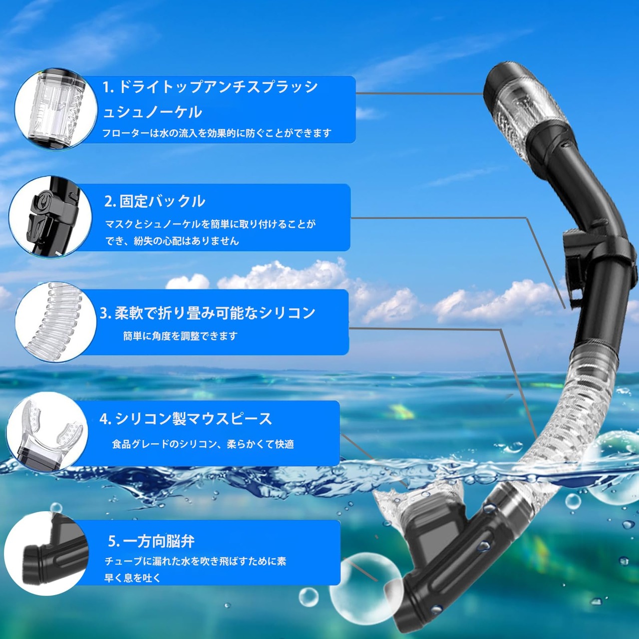人間工学に基づいたシュノーケル: ドライシュノーケルは無臭のシリコーン 素材でできており、シリコーン 素材のシュノーケルは独特の匂いがありません。 マウスピースは食品グレードのシリコン素材を使用しており、非常に噛み心地が良く、不快な臭いを発せず、シュノーケルは折りたたんで持ち運びが可能。 柔らかいシリコンホースなので、長時間シュノーケリングしてもアゴが疲れにくく、しなやかで快適です。調節可能なバックルにより、ヘッドバンドを簡単に固定できます。 大人、ティーン、男性、女性に適しています。