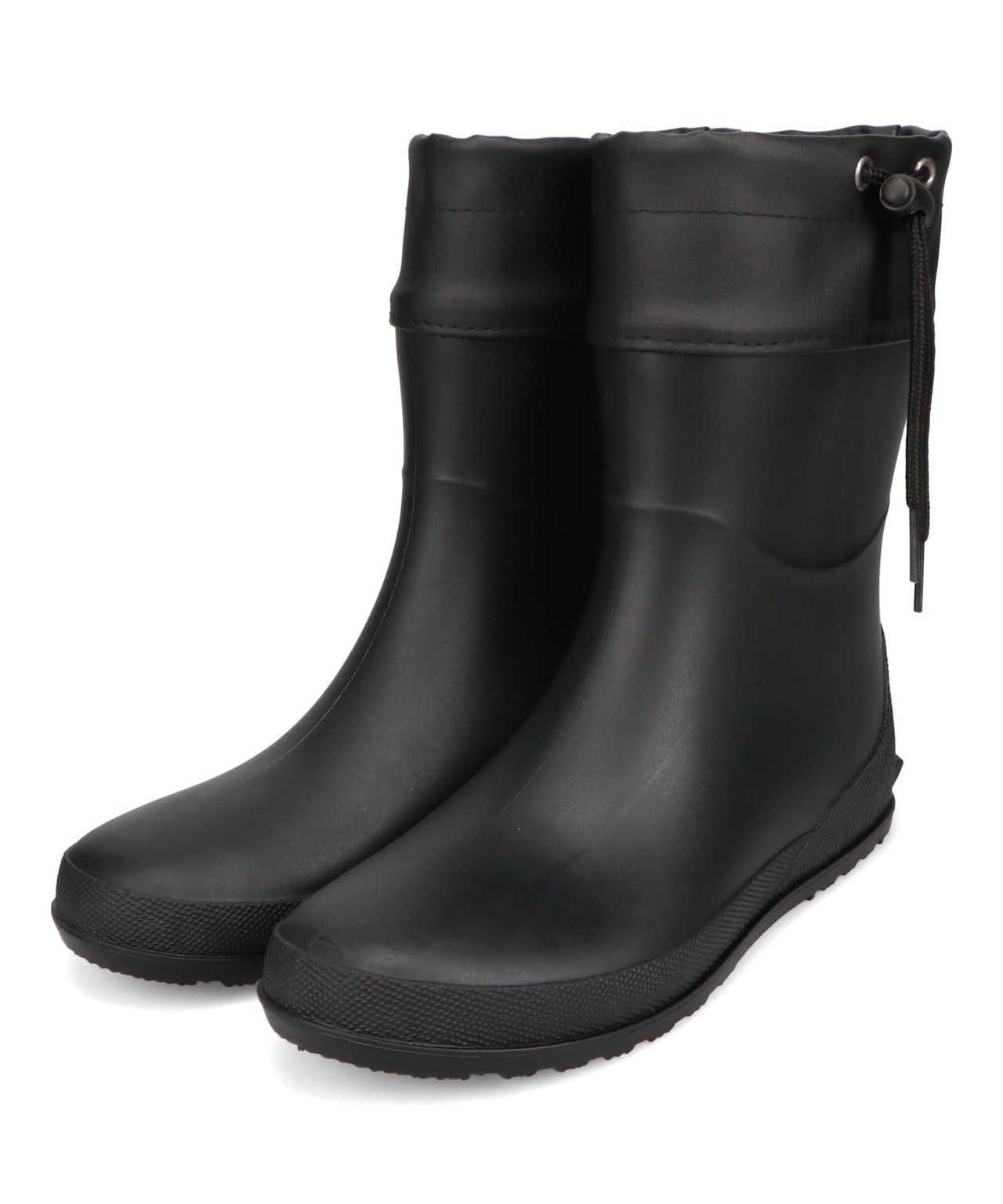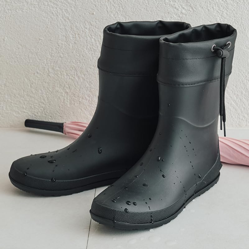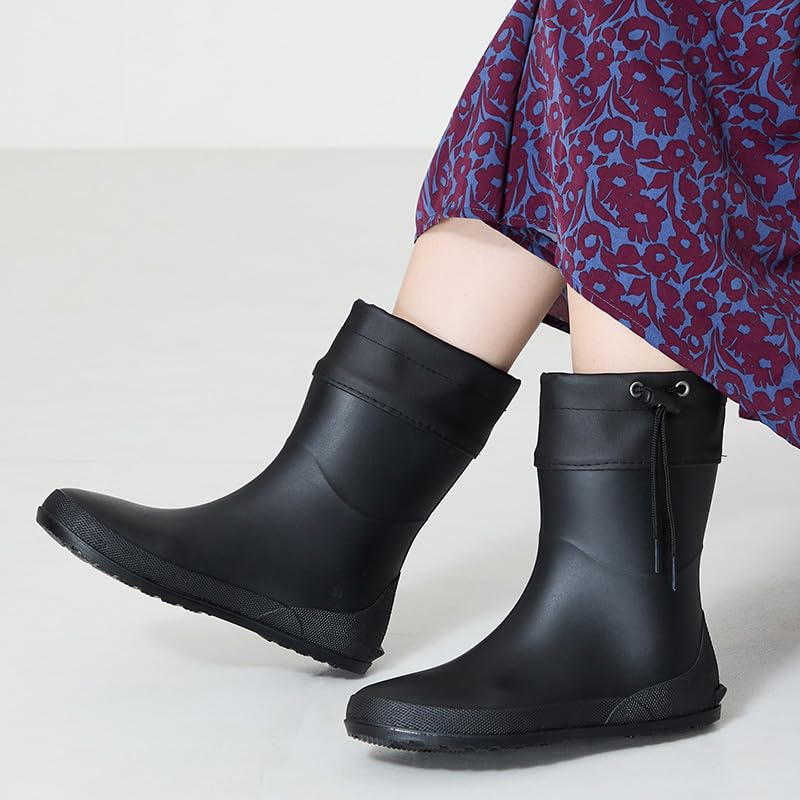 足の動きを妨げない柔らかな材質のレインブーツは、履き口部分にドローコードが付いており、ぎゅっと絞ればより雨水が入りにくい防水仕様。見た目以上に軽い上に、楽に履けるフラットヒールなのも嬉しい。程よい長さのミドル丈でコーディネートの幅も広がるアイテム。雨の日はもちろん、アウトドアシーンなど幅広いシーンで活躍する心強い1足。