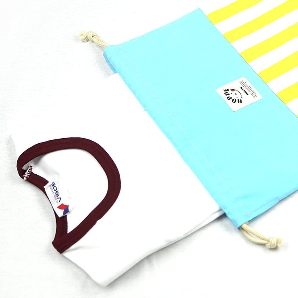 ・お子様でも扱いやすい巾着タイプ。服以外にもおもちゃやシューズを入れたりとマルチに活躍する巾着です。