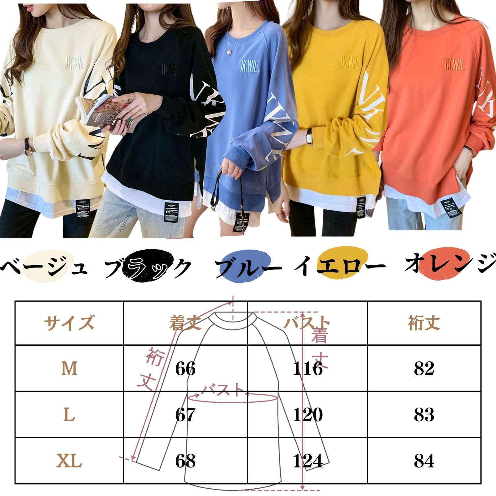 [SeiunAn] トレーナー レディース ロンT スウェット 長袖 薄手 秋 冬 プルオーバー 春 トップス レイヤード 重ね着風 切り替え スリット入り 英字プリント ロゴ 長袖tシャツ フェイクツーピース ゆったり 大きいサイズ おしゃれ 韓国