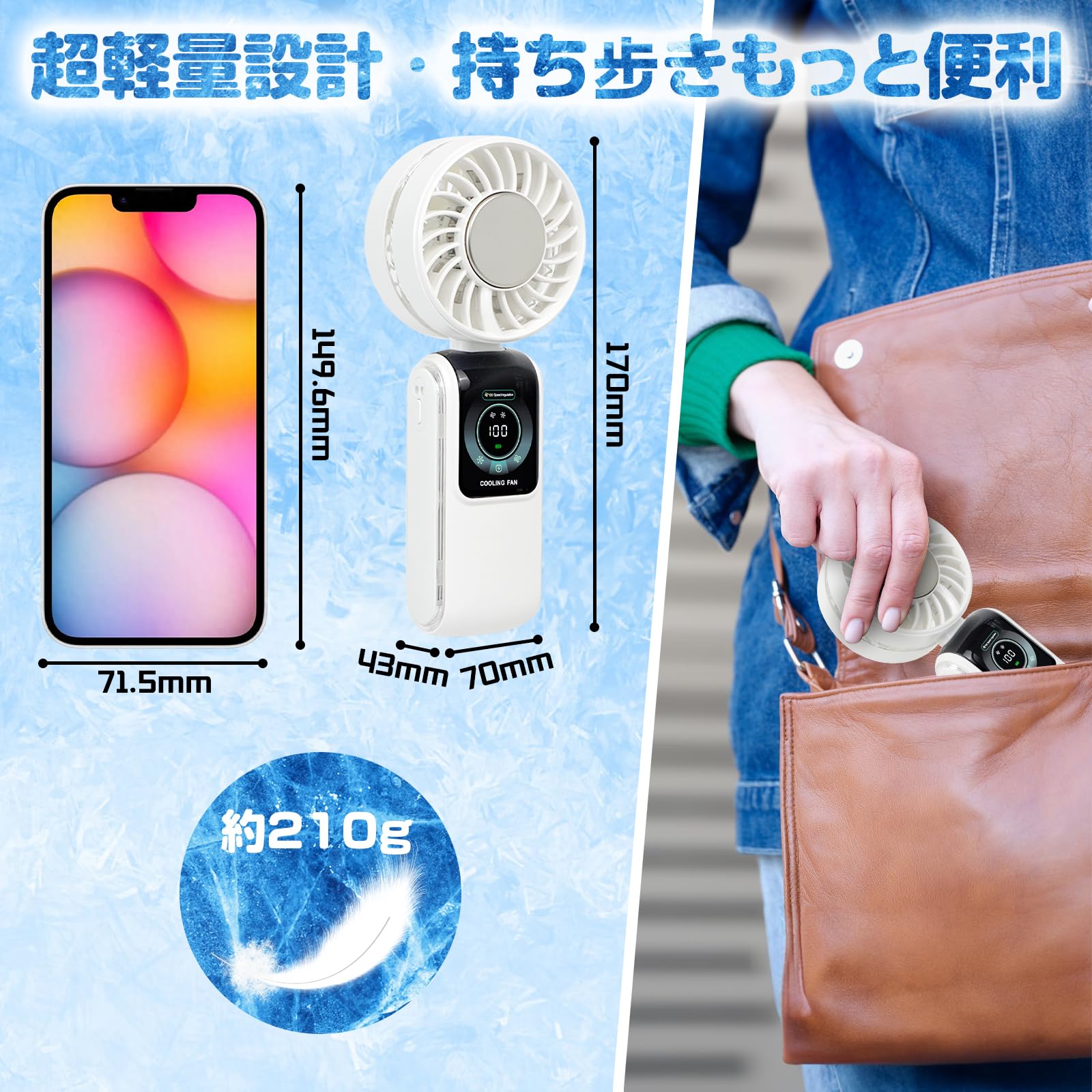 【超軽量&コンパクトで持ち運び便利】静音ハンディファンのサイズはわずか170x70x43mm、重さはわずか210gで、さまざまな小さなバッグに簡単に入れることができます。軽量ボディ、人間工学に基づいたデザイン、持ち心地も快適。静音 手持ち扇風機 として、図書館やオフィス、寝室でも騒音を気にせず使用可能。特に ハンディファン 静音 機能は、夜間使用や職場での利用に重宝されます。手持ち扇風機は暑さ対策グッズ&熱中症対策&冷却グッズ&夏の外出に必携品になります!この扇風機は、キャンプ、アウトドア、BBQ、スポーツ観戦、散歩、山登り、サイクリング、遠足、お祭り、花火大会、通勤・通学、さらには屋内外のあらゆるシーンで活躍します。どんな場面でもあなたを涼しくサポート!