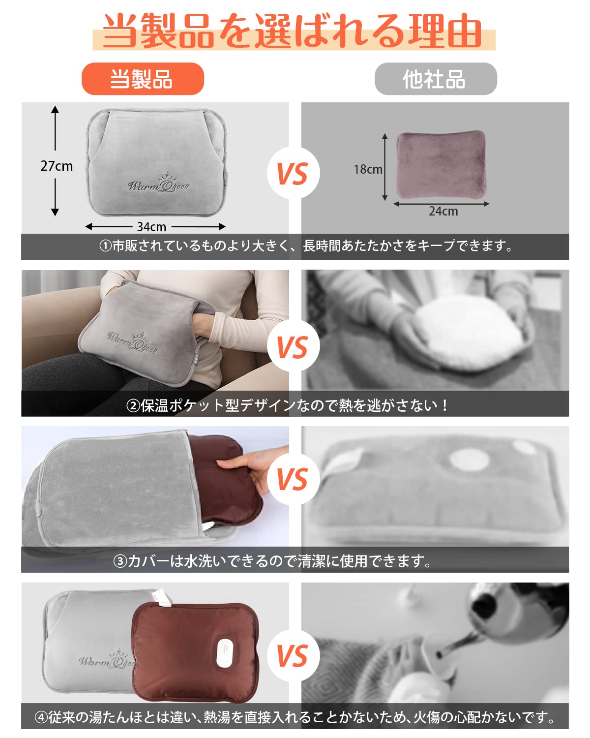 【高品質素材·6層防爆設計·自動断電】 弊社の湯たんぽは6層防爆設計、水と電気の分離設計、腐食しない水を用い、温度過熱防止装置は二重保護チップでできており、湯たんぽの温度が77を超えると自動的に電源が切れる安全設計です。【コードレス どこでも使える・癒し効果が抜群でプレゼントに最適】湯たんぽ本体はぷにぷにとした柔らかい感触をしており、身体にしっかりと密着してくれます。繰り返し使えるポカポカ温かい充電式エコ湯たんぽで、快適な冬の暮らしを。就寝前のお布団を温めるアンカとして使用したり、膝の上に乗せてカイロとして使用したり、じんわりと身体を温めます。冷え性女子の強い味方、繰り返し使えるエコ湯たんぽ。就寝時、布団の中であれば朝まで温もりが持続します。