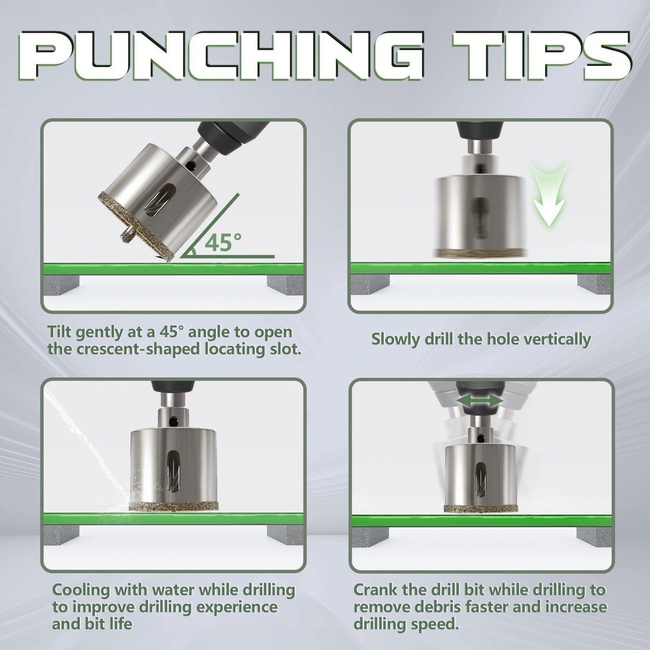 【簡単な操作】操作はシンプルで、他の特別なガイドツールは必要ありません。位置決め用ドリルビットが取り付けられたタイルホールソーを使用して穴の位置を決め、位置決め後に位置決め用ドリルビットを取り外し、その後、タイルホールソーで直接穴を開けるだけです。