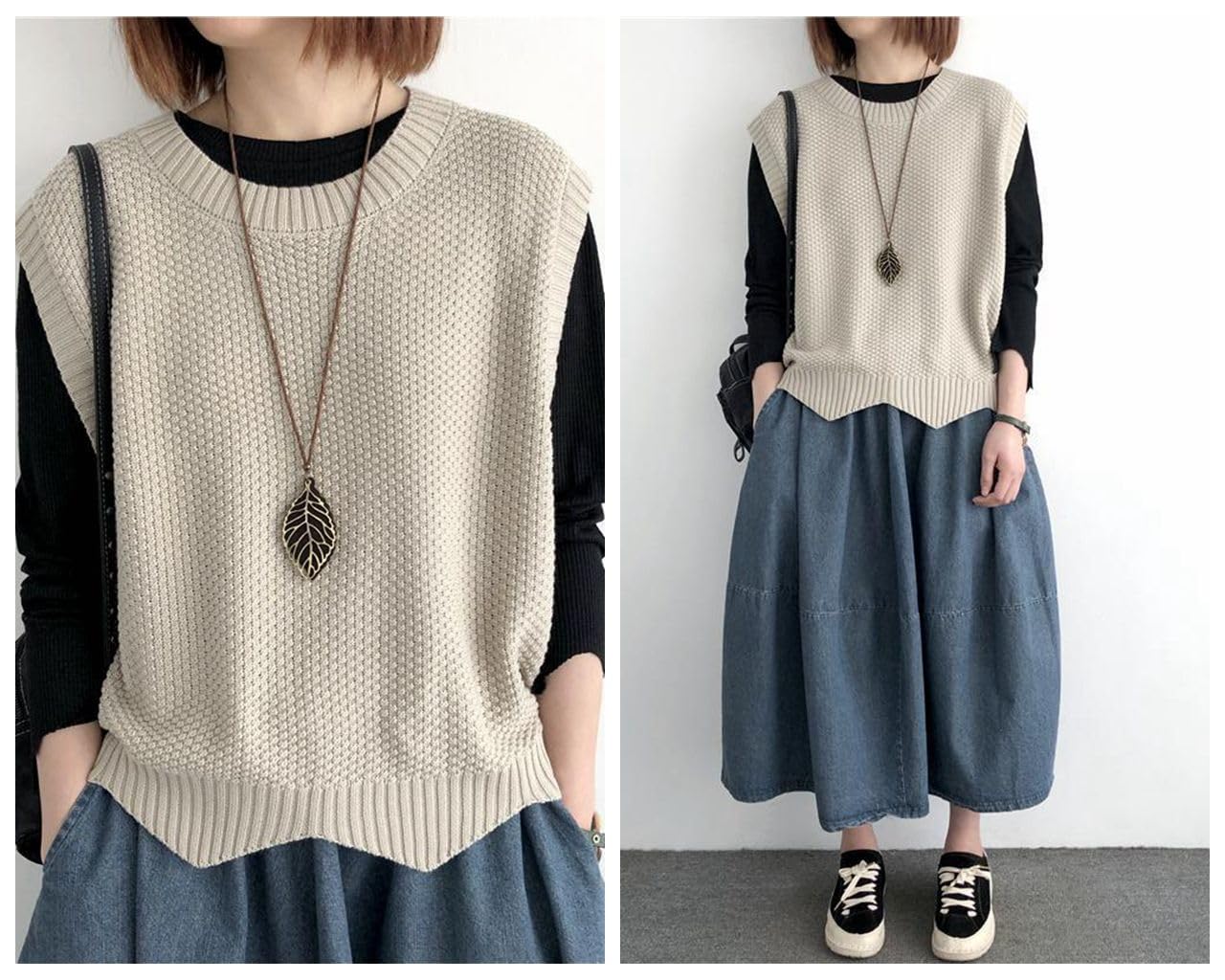 [Grcemlvfe] セーター レディース ニットベスト チョッキ プルオーバー フラクタル ワッフル 丸首 不規則な裾 ゆったり シンプル 着痩せ カジュアル コーディネート 通勤 春 秋 冬