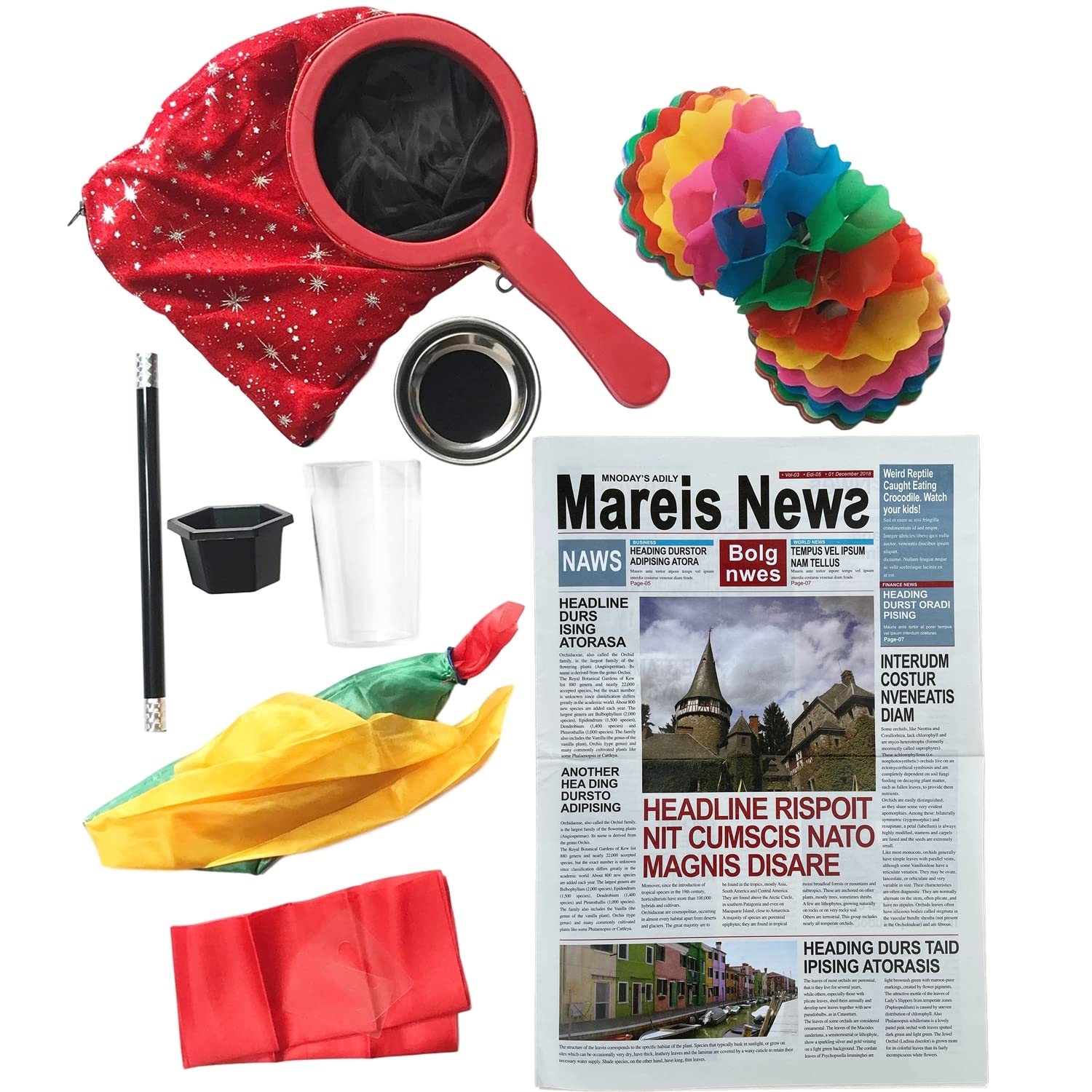 【セット内容】■花が現れる杖:全長23㎝(花の高さ19㎝、鉢の幅5㎝) 重さ20g ■色が変わるハンカチ:伸ばしきった状態で約70㎝ 重さ10g ■魔法の小袋:28㎝×15㎝ 重さ150g ■スマホを通るハンカチ:35㎝×35㎝ 重さ7.5g ■濡れない新聞紙(英字新聞風):54㎝×39㎝ 重さ20g ■通過するコインのお皿:直径19㎝ 重さ18g