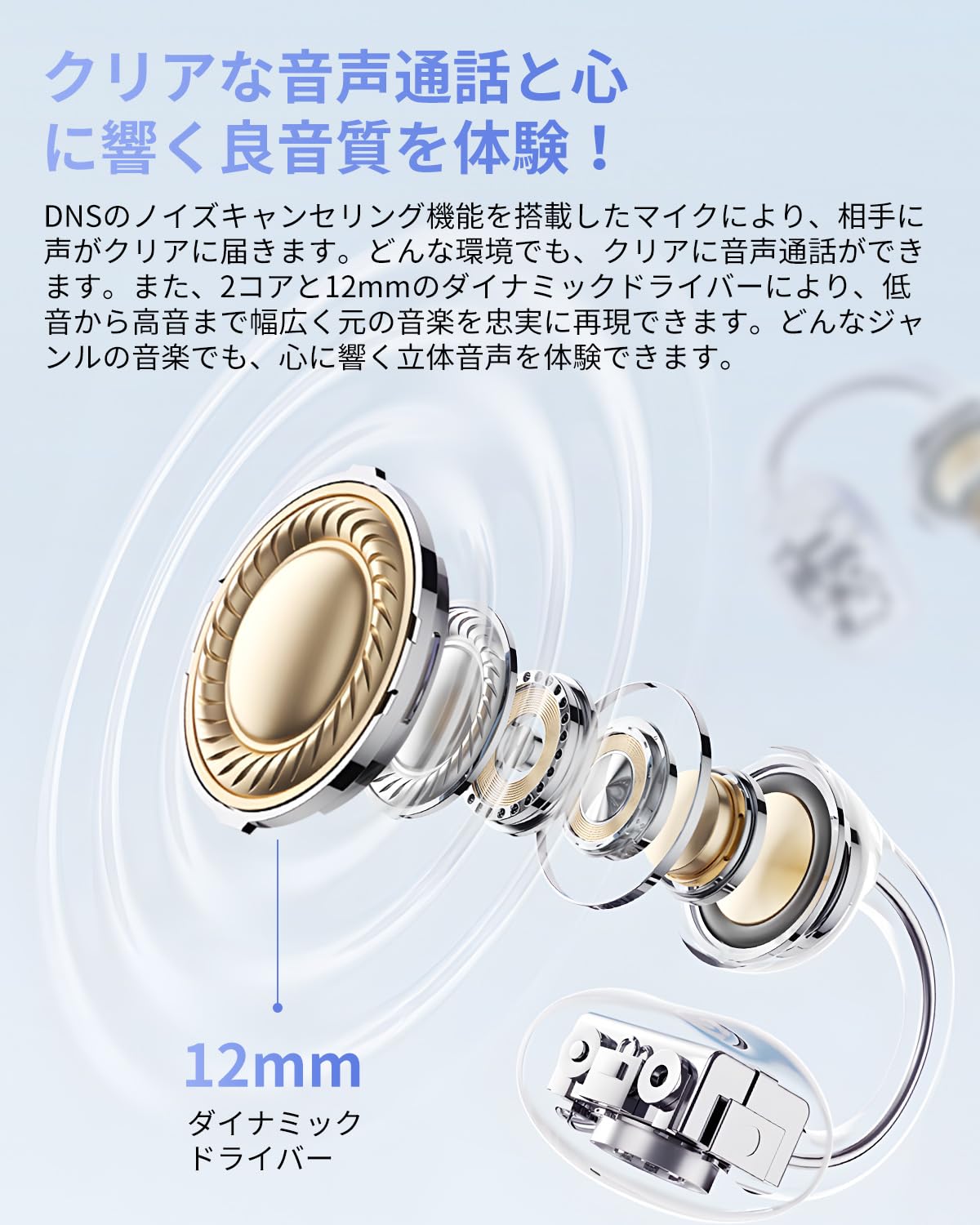 【バランスの取れた音質】 12mmのダイナミックドライバーを搭載し、低音から高音までバランスの取れた音質を提供します。どんなジャンルの音楽でも、クリアで迫力のあるサウンドを楽しむことができます。