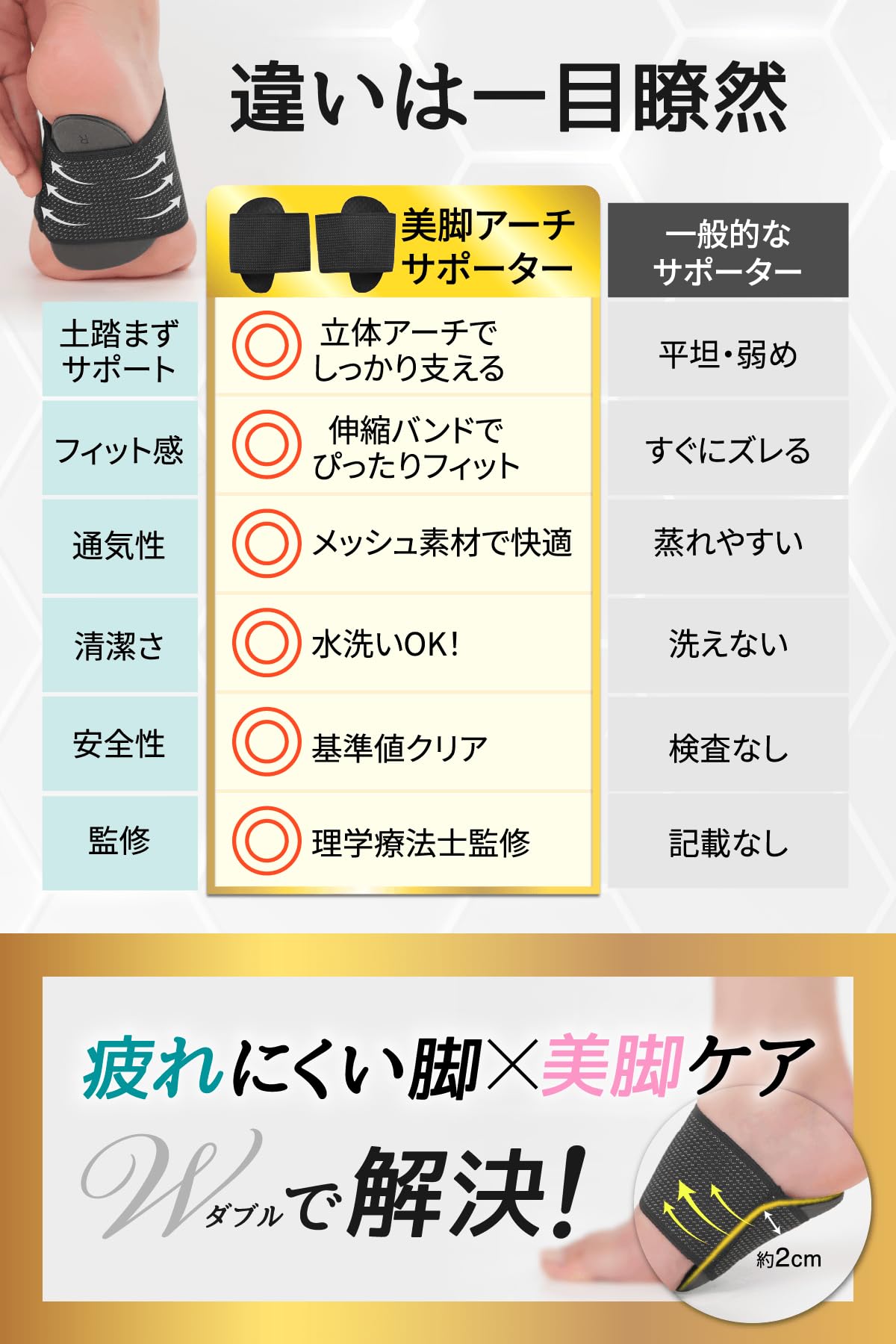 【現役の理学療法士監修!土踏まずアーチサポーター】「立ち仕事で足裏に疲れがたまる」「扁平足で歩くと足が疲れやすい」「足をほっそり綺麗に保ちたい」といったお悩みを解決するお助けアイテムです!足裏にアーチを作り、歩行時の衝撃を緩和。我慢できない足の疲れやツラい悩みを柔らかくサポートします。