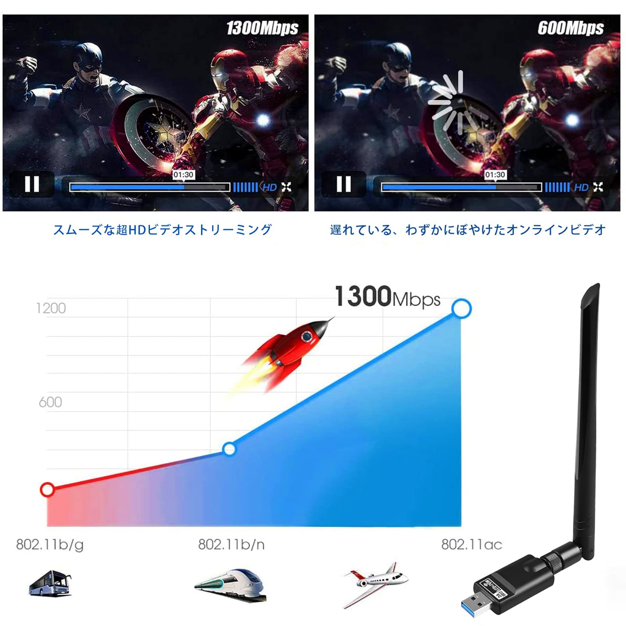 【5dBiアンテナ・広範囲】無線LAN子機は最大5GHz帯(867Mbps)+2.4 GHz帯(300Mbps)の超高速接続、最高1300Mbpsで通信可能になります。信号がより安定、高速で、障碍物が多い環境においても、安定したWi-Fi通信ができます。可回転5dBi高増幅アンテナを搭載、安定した送受信を行うことができ,部屋を離れでも壁などの障害を越えます。注: wifi6 のアップグレードはサポートしていません