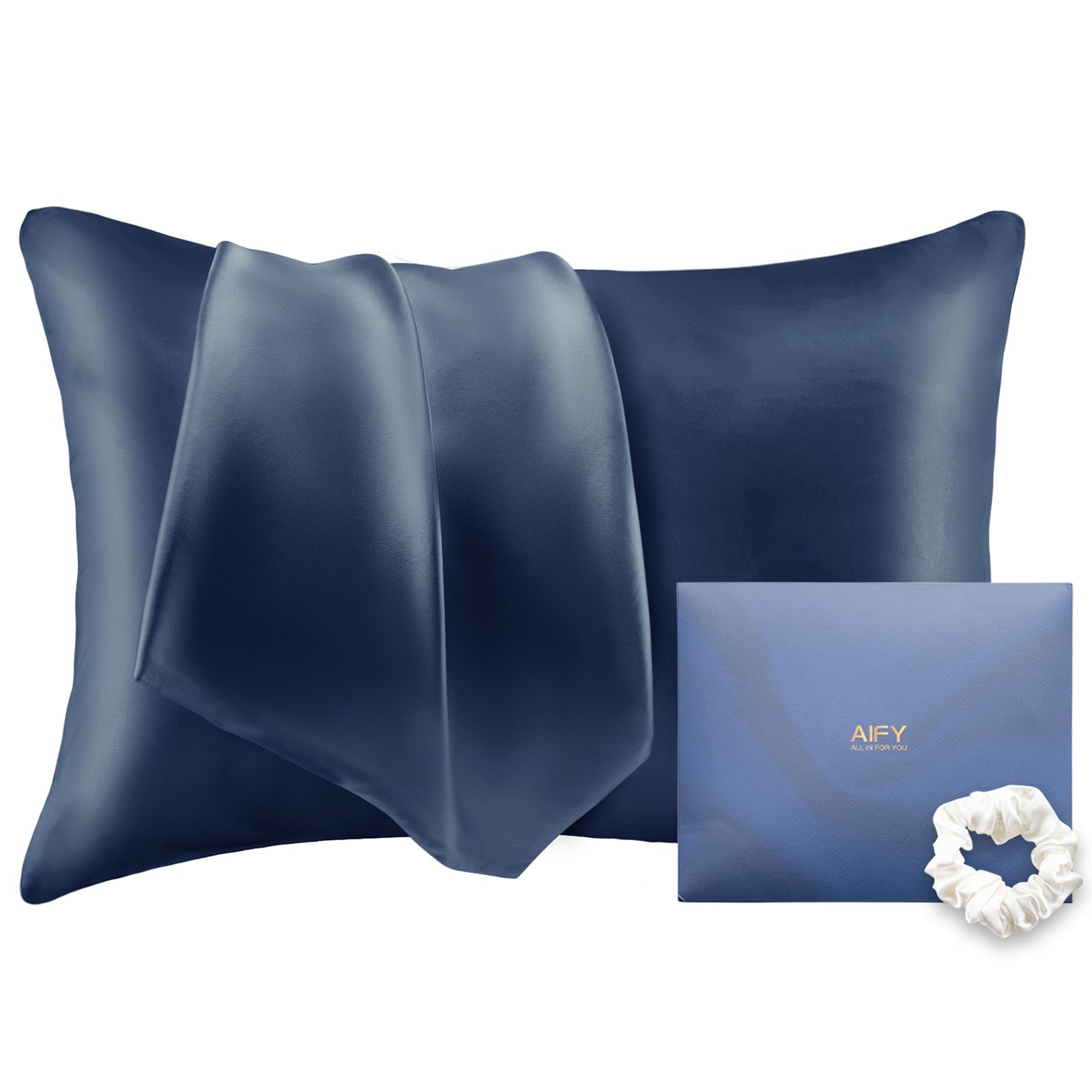 AIFY シルク枕カバー 【TVで紹介】 片面100%シルク 6Aクラス 枕カバー 美髪 美肌 髪の毛のダメージ減少 サラサラ ひんやり 保湿 通気性 洗える 敏感肌に優しい 抗菌防臭 静電気防止 摩擦軽減 ファスナー式 1枚セット 35×50cm ネイビー