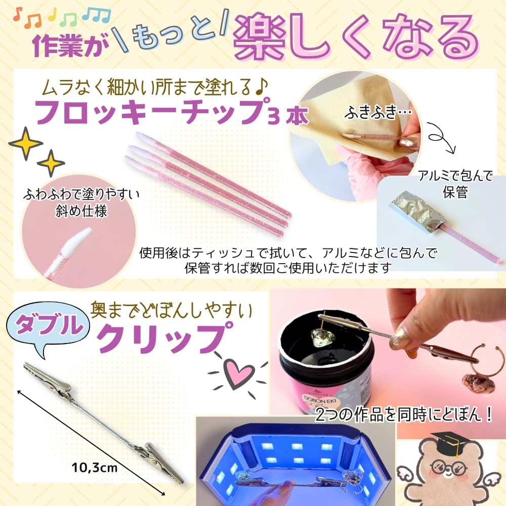 ●商品内容:本体、15ml容器、クリップ2個 ●内容量:どぼん液本体50g サラサラしているテクスチャーのため、塗りやすく硬化時間も速いです。
