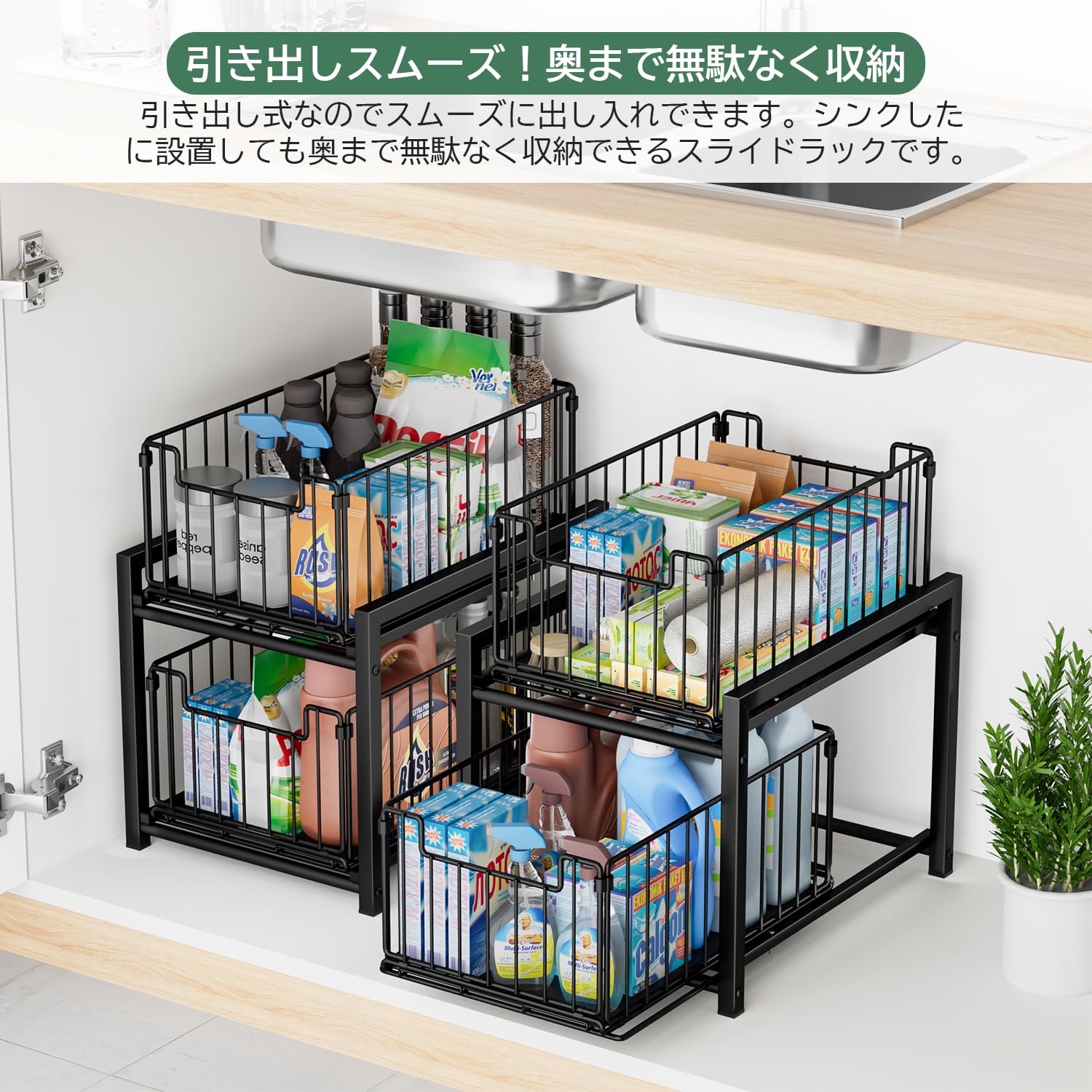 ラクラクスライドで、シンク下の奥まで有効活用:2段スライドラックは細かなキッチンツール、食品・ラップ・ホイルなどのストック品をシンク下空間利用して効率よく収納可能です。スライド式でスーッと引き出しが手前にスライドするから、取り出しやすく、片付けやすい。