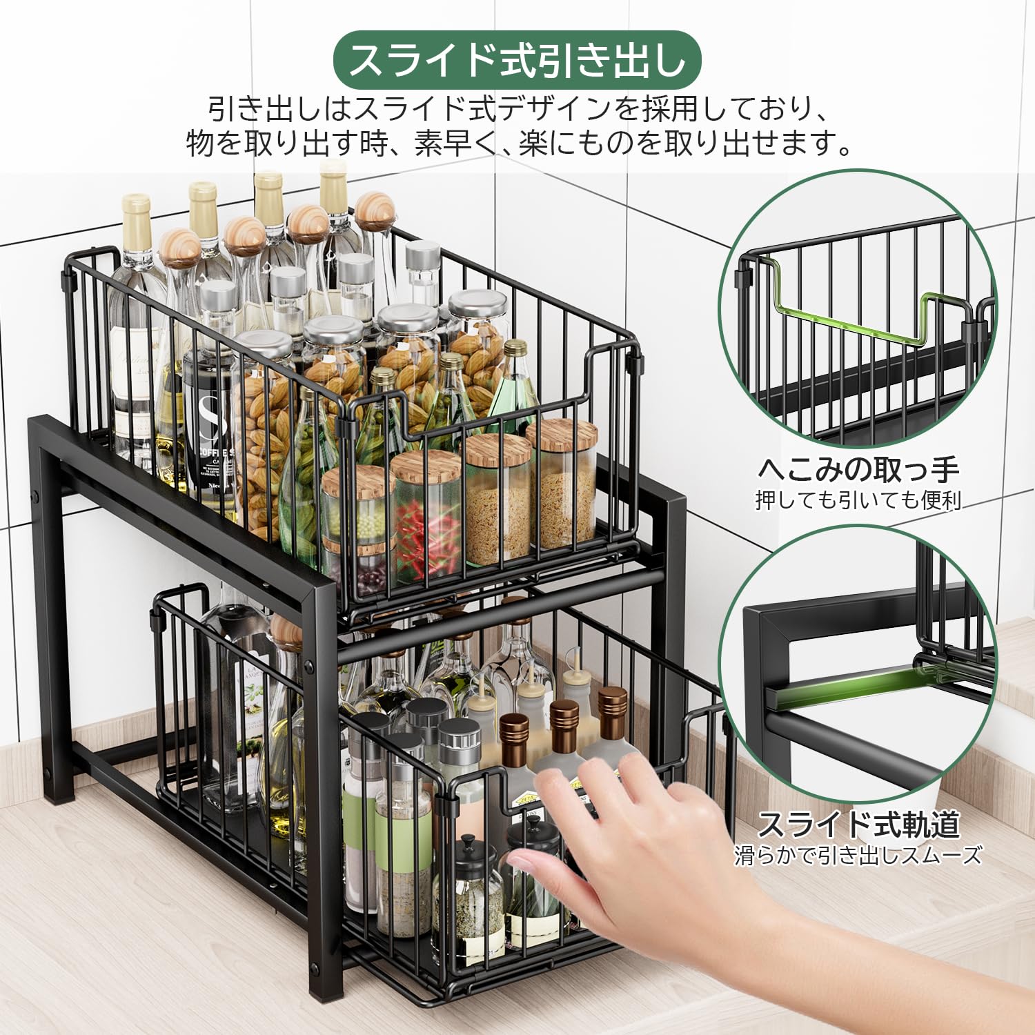 多機能ラック:シンク下はもちろん、調味料置くことも、洗面台下を置くことも、デスクの雑物や化粧品などは収納できます。奥のものが取り出しやすく、しまいやすいスライド式、スムーズに引き出せる、いろいろな場所に大活躍です。