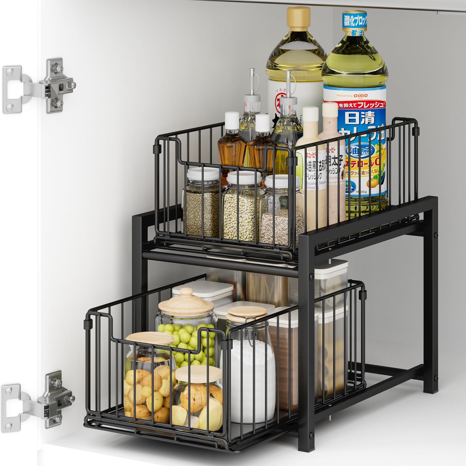 【数量限定】DAIWIN シンク下収納 スライドラック 棚2段 幅27 引き出し 調味料収納ラック 台所収納 大容量 キッチン収納ラック 隙間収納 組立簡単 省スペース 2段ラック 防汚 防錆 防油 (ブラック) | asaRulu0511