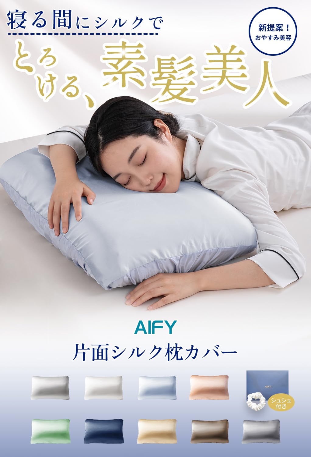 AIFY シルク枕カバー 【TVで紹介】 片面100%シルク 6Aクラス 枕カバー 美髪 美肌 髪の毛のダメージ減少 サラサラ ひんやり 保湿 通気性 洗える 敏感肌に優しい 抗菌防臭 静電気防止 摩擦軽減 キャップ型 1枚セット 43×63cm ミルキーブルー