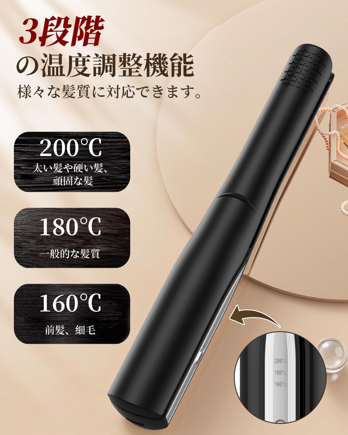 【3段階温度調整&自動OFF機能】 充電式ヘアアイロン は新型PTCヒーター搭載により、業界平均1.5倍の加熱効率を実現しています。160℃設定は前髪やデリケートな髪質向け、180℃はスタンダードなスタイリングに、200℃は剛毛やくせ毛の整髪に最適です。30分経過後の自動電源オフ機能で消し忘れの心配がありません。ヘアアイロン コードレス 人気ランキング上位製品と同等の安全基準をクリアしています。