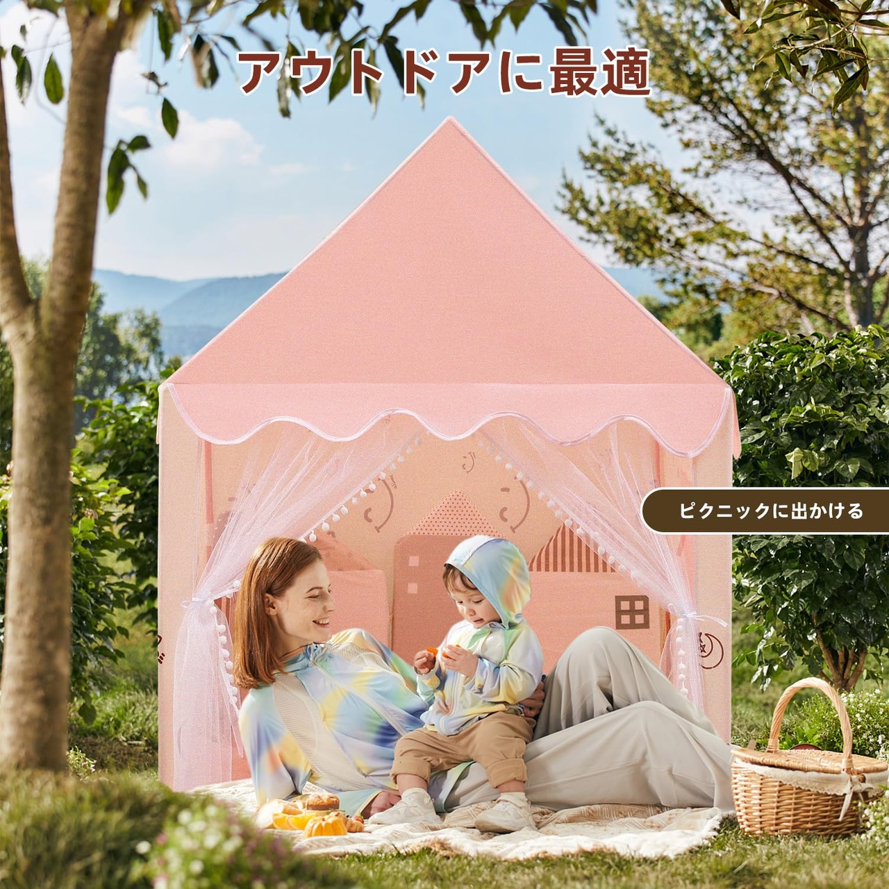 【安全な生地】子供用プレイグラウンドテントは高品質のポリエステル生地で作られており、長持ちし、ひび割れ防止、無毒、無臭でお子様にも安全です。このかわいいピンクのテントは女の子のために設計され、心から彼らの王女の夢を実現するのに役立ちます。