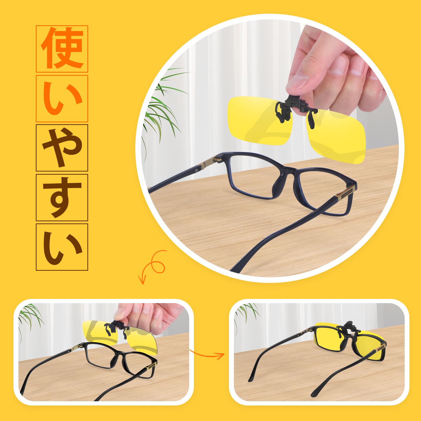 簡単に装着できて便利 - メガネに簡単に装着でき、使わない時は上にパカッと跳ね上げるだけで、車の運転中でも便利に使えます。特に日中のドライブや短いトンネルに入った時など、すぐに跳ね上げられるので非常に便利です。日常的に屋外で使うのにも最適です。曇りの日や室内では外して使用します