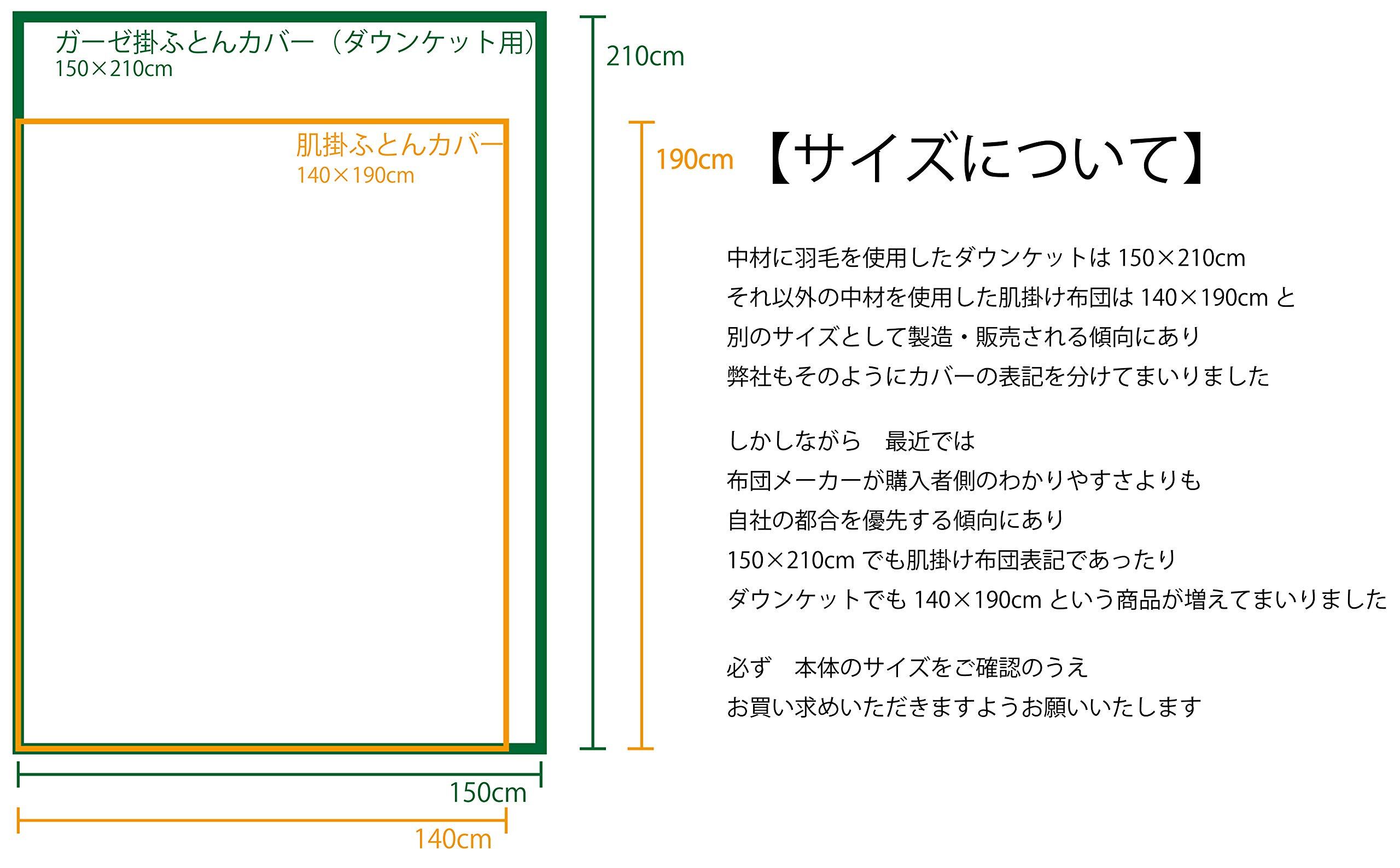 サイズ 140cm×190cm 肌掛けふとん用シングルサイズ(ダウンケット用はサイズが異なります) 吸汗性に優れた綿100%ガーゼ生地を使用。裏地は白無地の和晒加工ガーゼ生地です。YKK社製ファスナー式・カバー内側8箇所にはふとんとのずれを防ぐYKK社製テープスナップ「SOFIX」付き。 (「SOFIX(R)」はYKK株式会社の登録商標です)日本製。