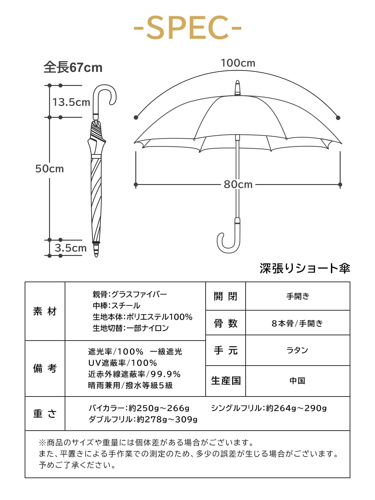 【美しいドームシルエット】まるくかわいいシルエットが魅力で、女性らしいエレガントな雰囲気を醸し出します。骨を深張りにした丸みを帯びたドーム型フォルムで、日差しからも雨からも包み込むようにしっかり守ってくれます。全長約67cm、親骨50cm、直径約80cmです。バリエーション24色展開!晴雨兼用で使える、上品で高級感のある日傘です。