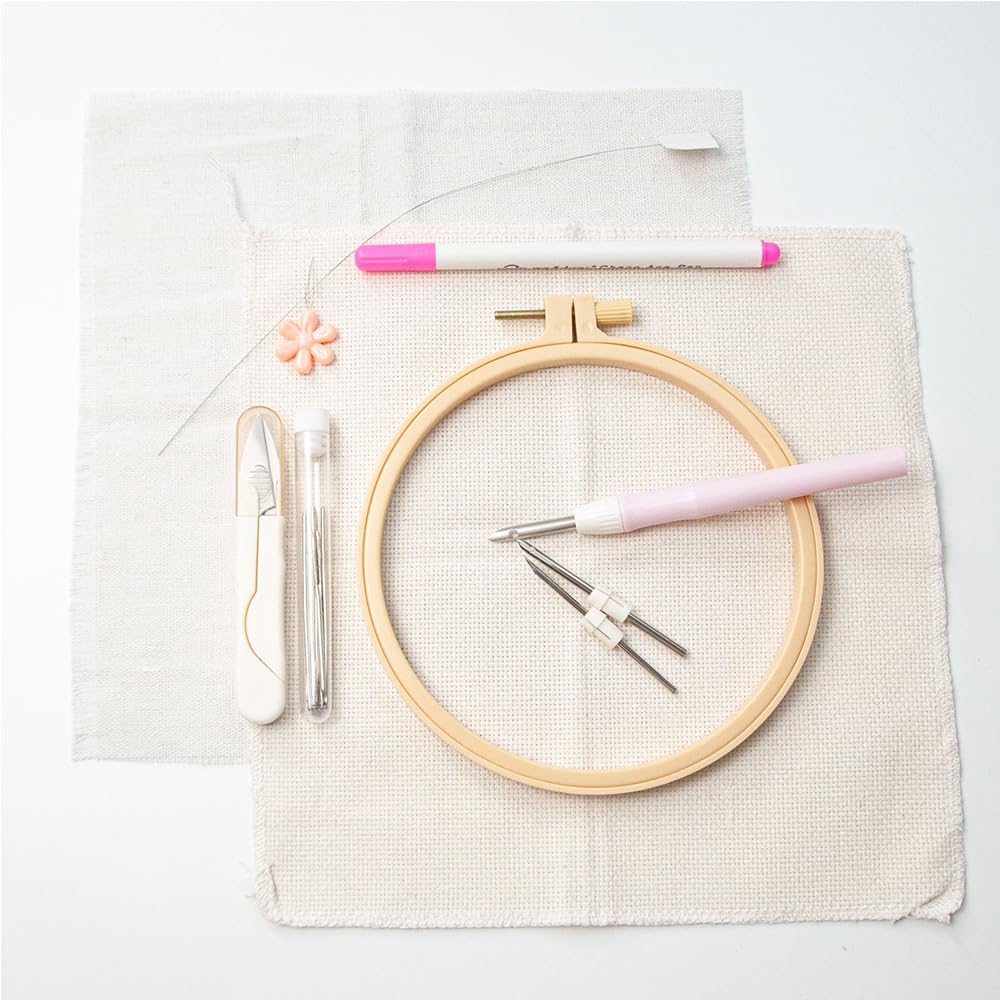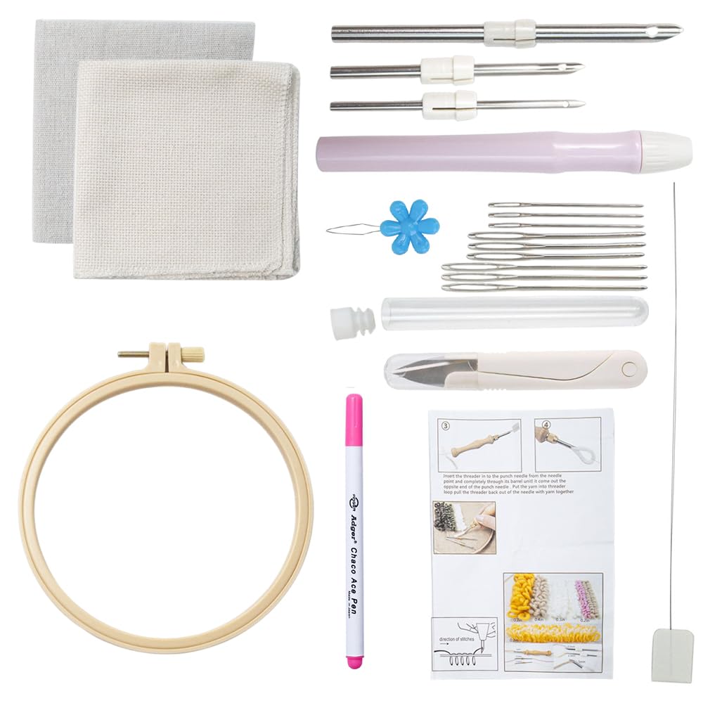 1. 【完全セット内容】私たちのパンチニードルキットは、16cmのプラスチック刺繍フープ(内径14cm)、3種類の替え針(5mm/3.5mm/2.5mm)を含む多機能ペン型パンチニードル、特製ピュアコットンとコットンリネン素材の刺繍布各24*24cm、精密なマーキングペン、9本の大きな目の針、U型白色小型ハサミ、糸通し器2本と使いやすい詳細な説明書を含んでいます。この一揃いで、あなたの刺繍旅がすぐに始められます!