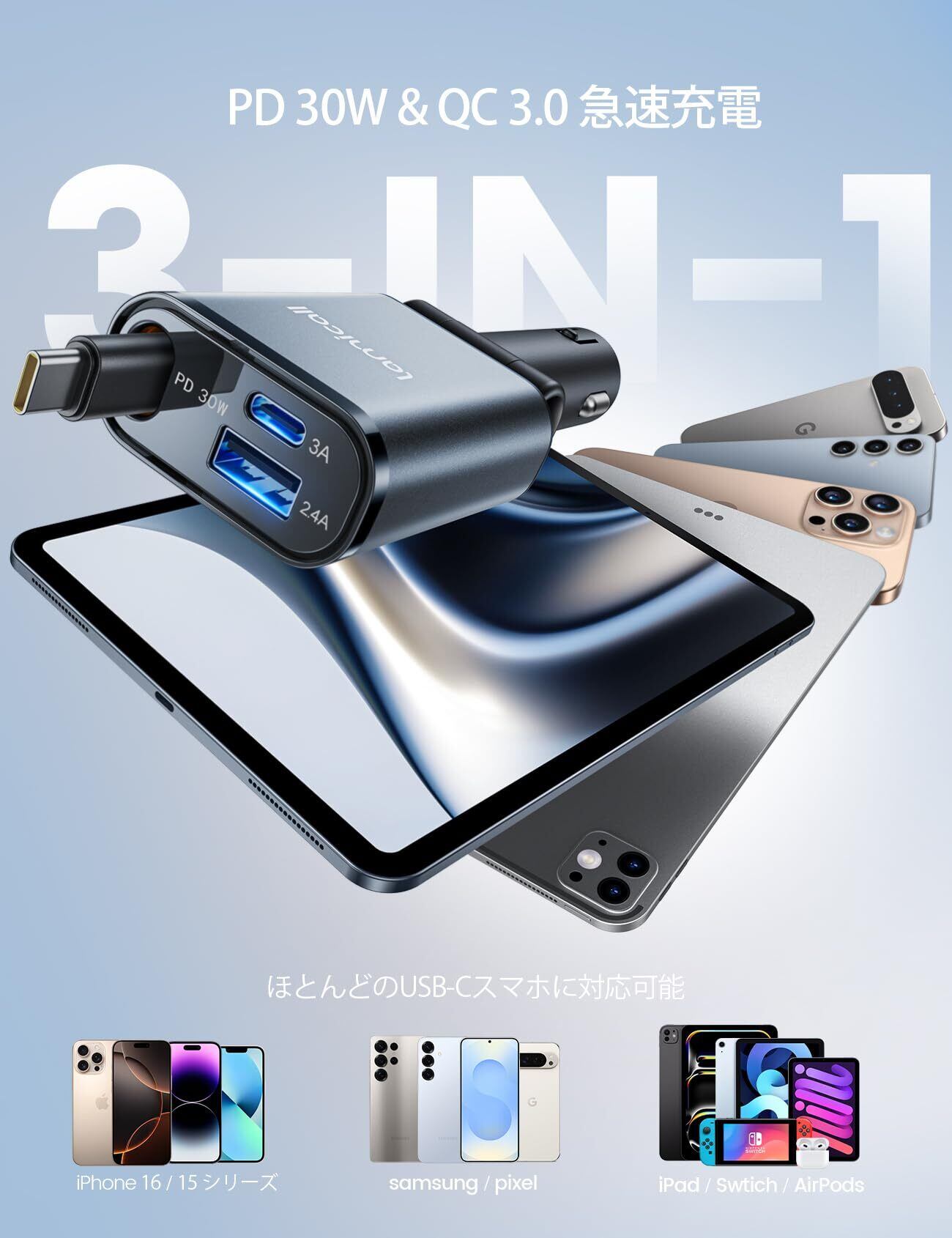 【数量限定】【2025超小型巻取り式】Lamicall シガーソケット 車 充電器:57W 急速 3in1 車載充電器 PD30W/PPS対応 12/24V車対応 3台同時可能 75cm Type-C ケーブル iPhone16/15シリーズ iPad/android/Apple Watch対応 カーチャージャー 高温/電流保護 旅行 出張 グレー | asaRulu0511