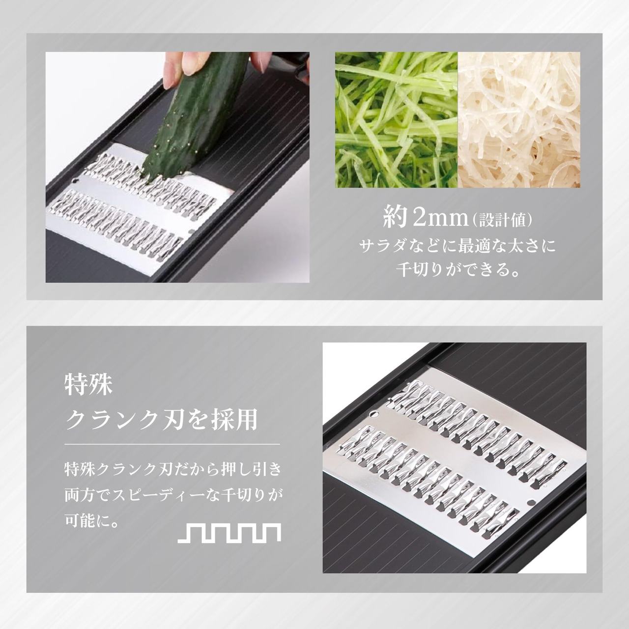 素材・材質:おろし器/ABS樹脂(アクリロニトリル・ブタジエン・スチレン)、千切り器(細)・本体/ABS樹脂、刃部/ステンレススチール、Vスライサー・本体/ABS樹脂、刃部/ステンレス刃物鋼、指ガード/ポリプロピレン、受け皿・本体/AS樹脂(アクリロニトリル・スチレン)、すべり止め/シリコーンゴム、フタ/AS樹脂
