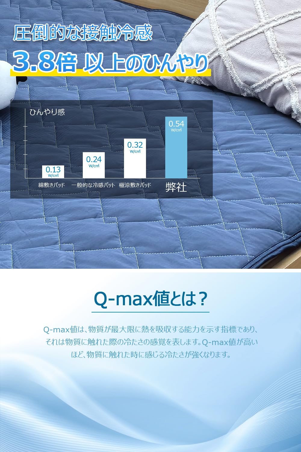 【Q-MAX0.54&ひんやり】測定結果による、敷きパッドのQ-max値は0.54で、標準Q-max0.2より2倍以上高くて、涼しい効果は触ったら感じます。触感はサラサラで、縮み・型崩れが起きにくいです。耐摩耗性に優れています。体に触らない部分は熱伝導で熱を退散し、温度が下がるりますので、ひんやり感を一晩中に続けます。