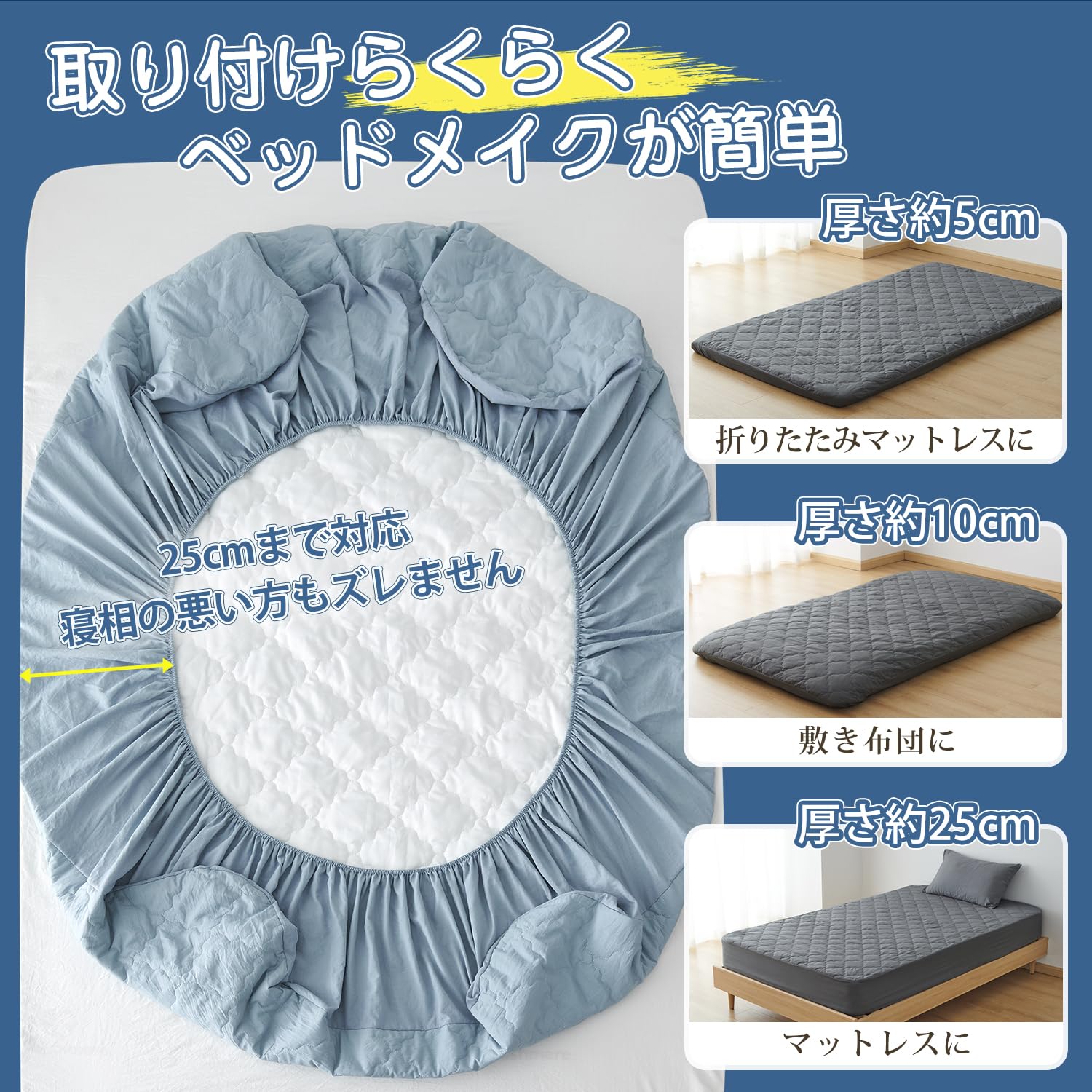敷きパッドとボックスシーツが一体化している:敷きパッドとボックスシーツが一体化しており、装着が簡単で便利です。
